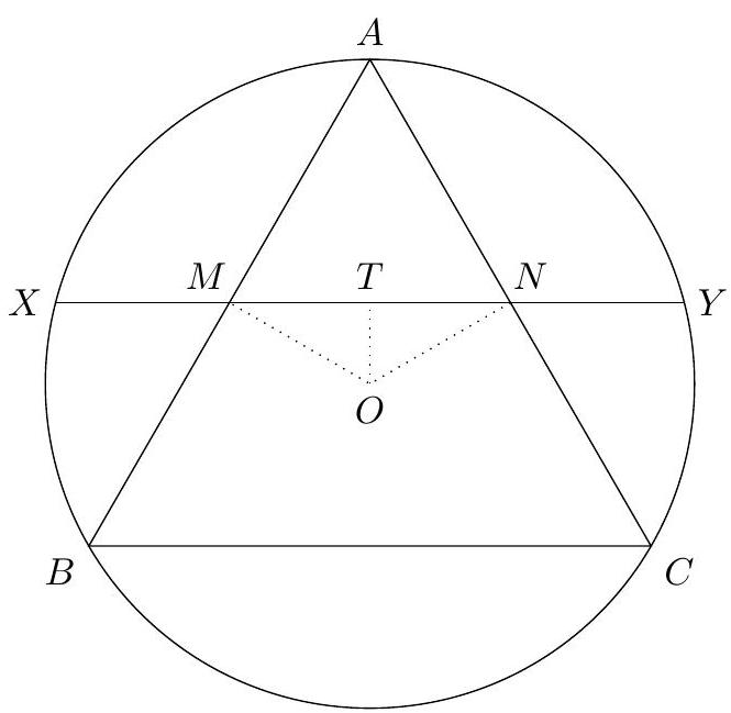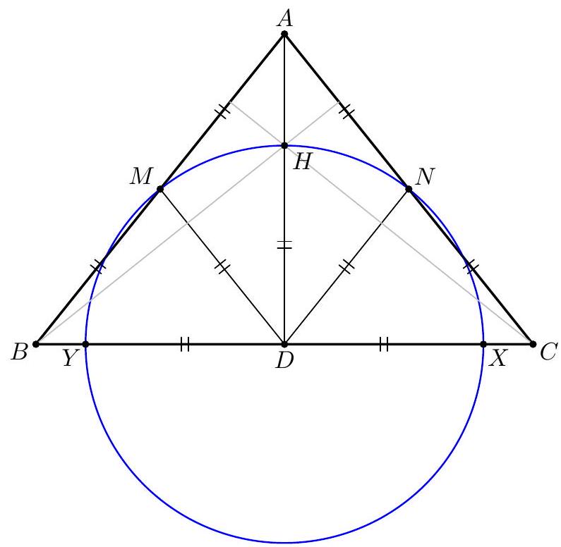 Let $A B C$ be an acute isosceles triangle with orthocenter $H$. Let $M$ and $N$ be the midpoints of sides $\overline{A B}$ and $\overline{A C}$, respectively. The circumcircle of triangle $M H N$ intersects line $B C$ at two points $X$ and $Y$. Given $X Y=A B=A C=2$, compute $B C^{2}$.