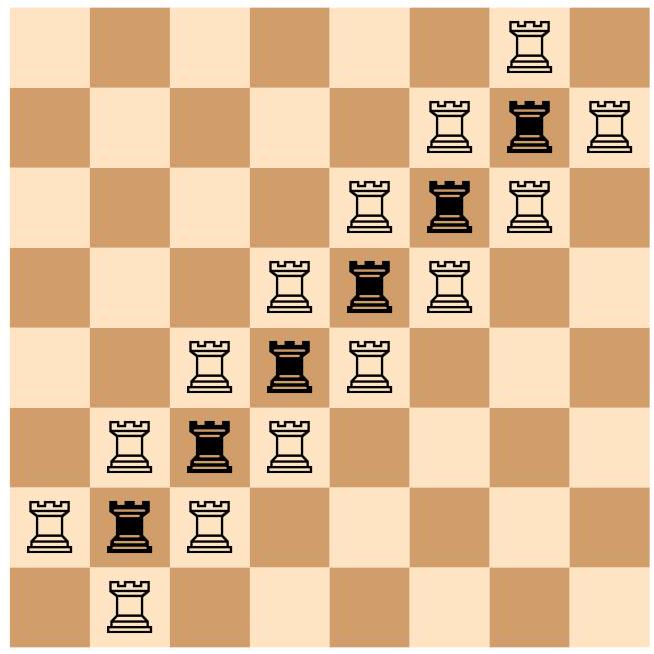 Now, we prove the optimality. As rooks can only attack opposite color rooks, the color of rooks in each row is alternating. The difference between the number of black and white rooks is thus at most the number of rooks. Thus, $k \leq 6+8=14$.