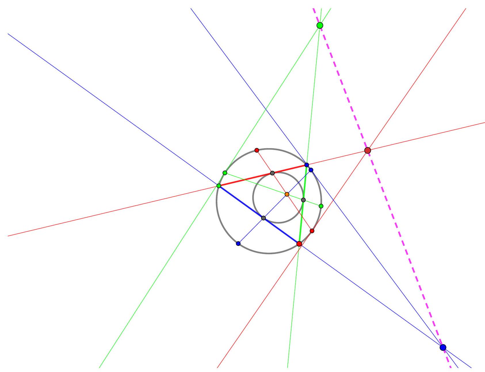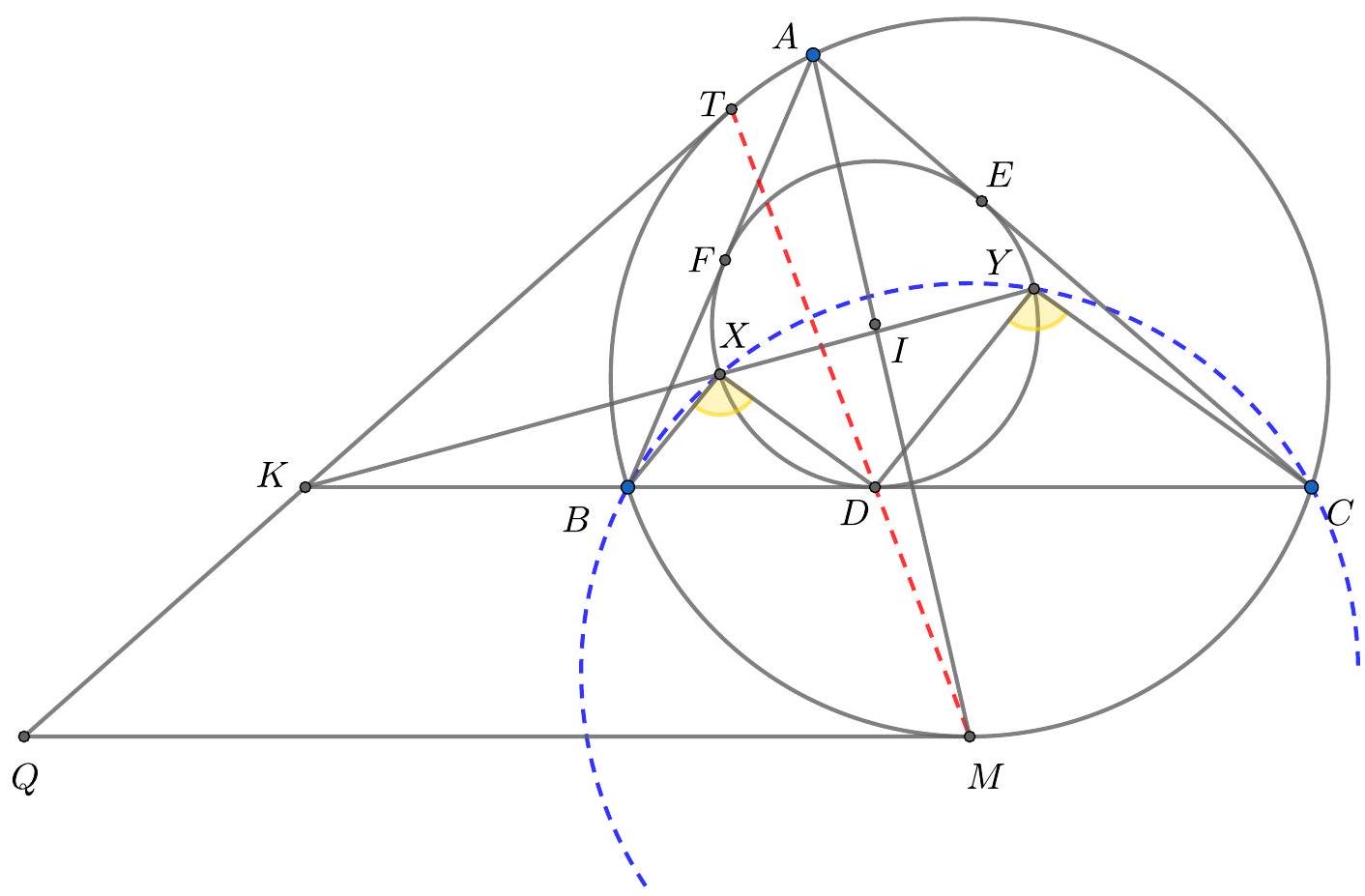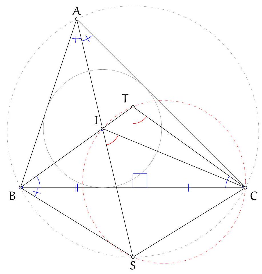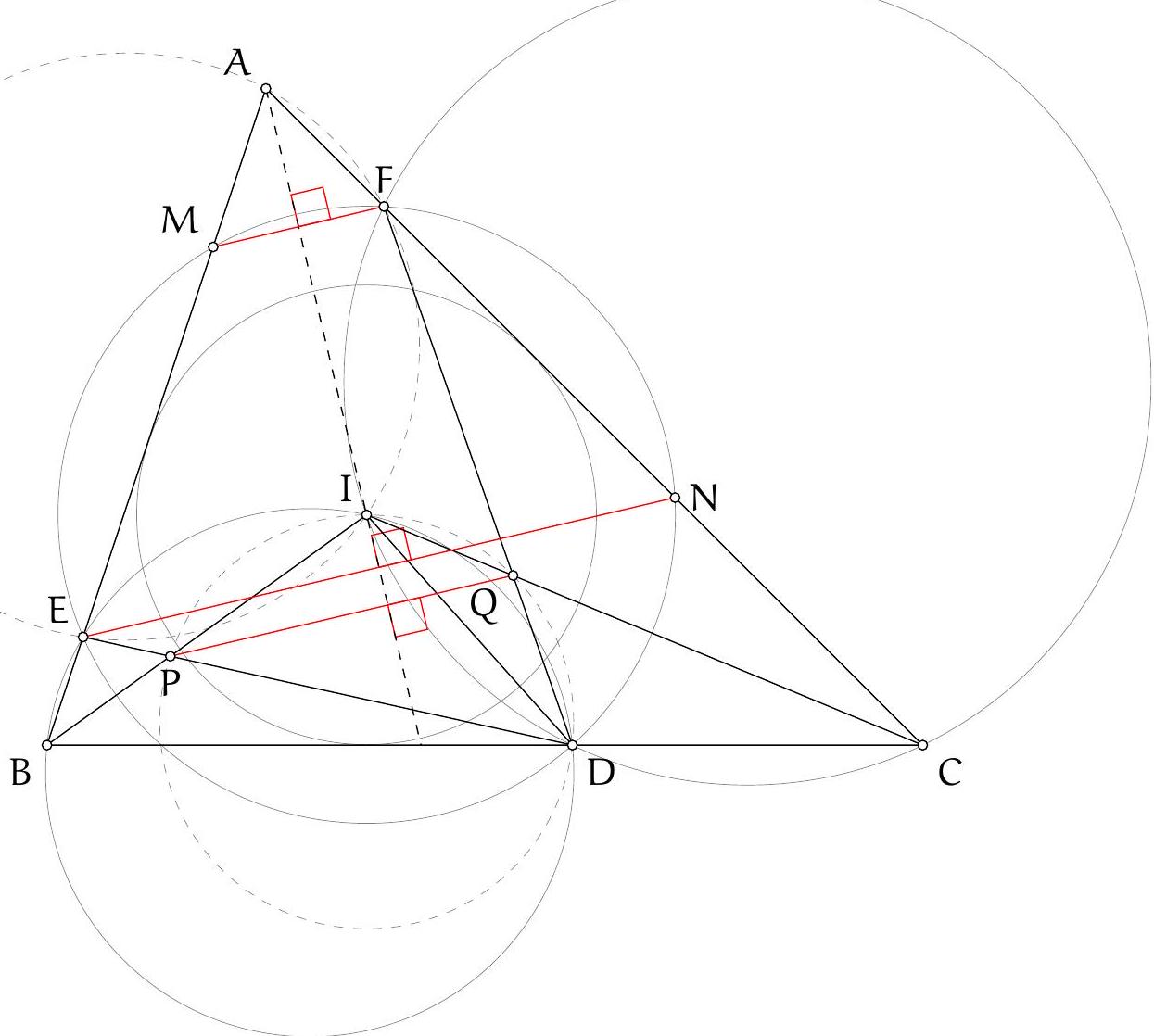 Comme I est le centre du cercle inscrit de $A B C$, I est l'intersection des bissectrices des angles $\widehat{A B C}, \widehat{B C A}$ et $\widehat{C A B}$ ou encore par isocélité des triangles $D B F, G C E$ et EAD que I est l'intersection des médiatrices de [DF], [GE] et [ED], le fait que ces médiatrices soient concourantes nous amène à dire que le quadrilatère DEFG est cyclique et de centre du cercle circonscrit I.