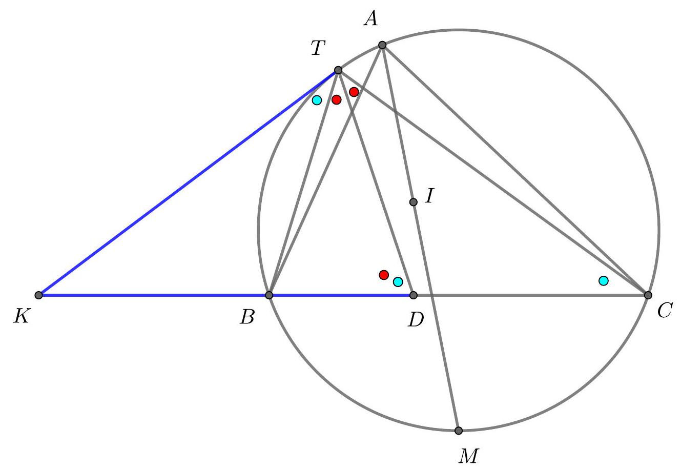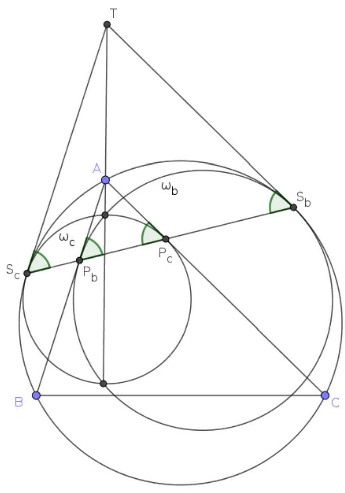 Angle chasing: $\left(B^{\prime} T, T C\right)=\left(B^{\prime} T, A T\right)+(A T, T C)$ according to the Chasles relation, using the cocyclicity of points $T, A, B_{A}$ and $B^{\prime}$ as well as that of points $T, A, B$ and $C$, we find $\left(B^{\prime} T, A T\right)+(A T, T C)=\left(B^{\prime} B_{A}, A B_{A}\right)+(A B, B C)=\left(B^{\prime} B_{A}, A B\right)+(A B, B C)=$ $\left(B^{\prime} B_{A}, B C\right)=\left(B^{\prime} B_{C}, B_{C} C\right)$, thus $\left(B^{\prime} T, T C\right)=\left(B^{\prime} B_{C}, B_{C} C\right)$, so the points $T, B^{\prime}, B_{C}$ and $C$ are cocyclic, which concludes the proof of the lemma.