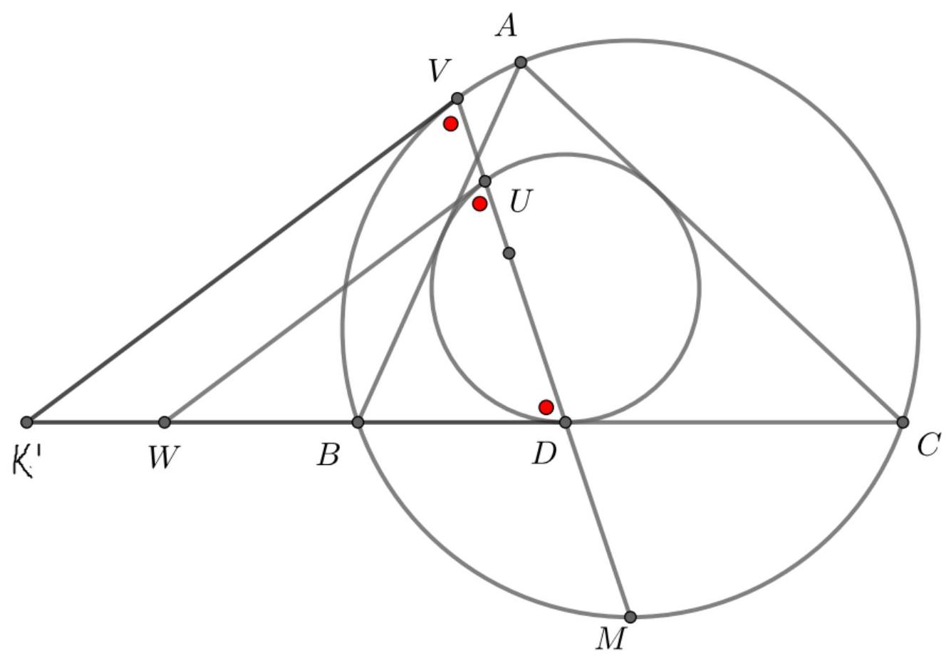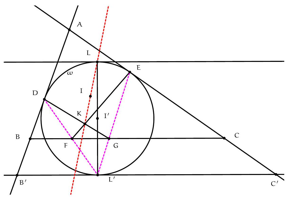 Soit ADE un triangle isocèle en $A$. Soit le cercle $\omega$, tangent aux droites (AD) et (AE) en $D$ et $E$. Soit $B$ et $C$ deux points au delà de $D$ et $E$ sur les droites ( $A D$ ) et ( $A E$ ). On suppose que $B C>B D+C E$. Finalement, soit $F$ et $G$ deux points sur le segment $[B C]$ de tel sorte que $B D=B F$ et $C G=C E$, les droites $(D G)$ et $(F E)$ se coupent en $K$, la tangente à $\omega$ parallèle à ( $B C$ ) et entre $A$ et ( $B C$ ) touche $\omega$ en L. Montrer que le centre du cercle inscrit de ABC est sur (KL).