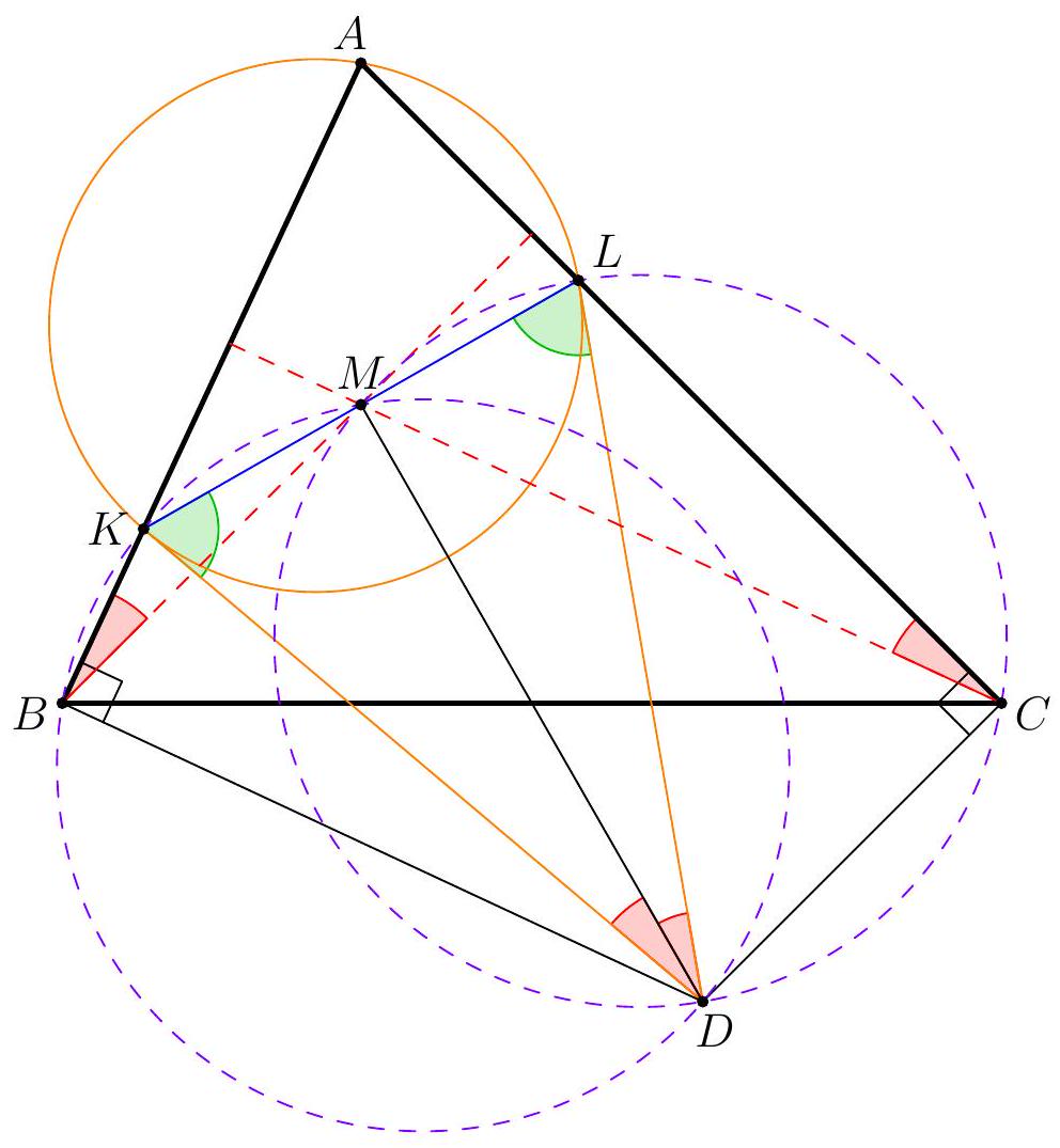 Then, we have that $D K=D L$ and $D K^{\prime}=D L^{\prime}$. We also have that $\angle K D L=\angle K^{\prime} D L^{\prime}=$ $\pi-2 \angle A$. Hence, we deduce $\angle K D K^{\prime}=\angle K D L-\angle K^{\prime} D L=\angle K^{\prime} D L^{\prime}-\angle K^{\prime} D L=\angle L D L^{\prime}$ Thus we have that $\triangle K D K^{\prime} \equiv \triangle L D L^{\prime}$, so we deduce $\angle D K A=\angle D K K^{\prime}=\angle D L L^{\prime}=$ $\pi-\angle A L D$. This implies that $A K D L$ is concyclic, which is clearly a contradiction since $\angle K A L+\angle K D L=\pi-\angle B A C$.