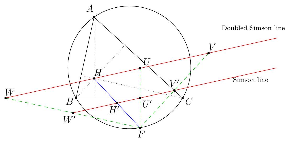 the Simson line of $X$ ) if and only if $X$ lies of $\Gamma$. The Simson line of $X$ in the circumcircle bisects the line segment $X H$ where $H$ is the orthocentre of triangle $A B C$. See Figure 2