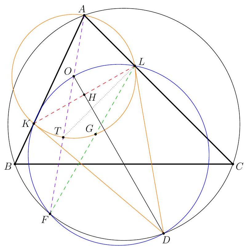 Our next project is to show that $L G F$ are collinear. Well $\angle F L K=\angle F O K$ (angles in the same segment of $\Omega$ ) and $\angle G L K=\angle G A K$ (angles in the same segment of $\Sigma$ ) $=2 \angle O A K$ ( $A K G$ is isosceles with apex $A)=\angle T O K$ (since $O A K$ is isosceles with apex $O$, and this is an external angle at $O$ ). The point $T$ lies in the interior of the line segment $F O$ so $\angle T O K=\angle F O K$. Therefore $\angle F L K=\angle G L K$ so $L G F$ is a line.