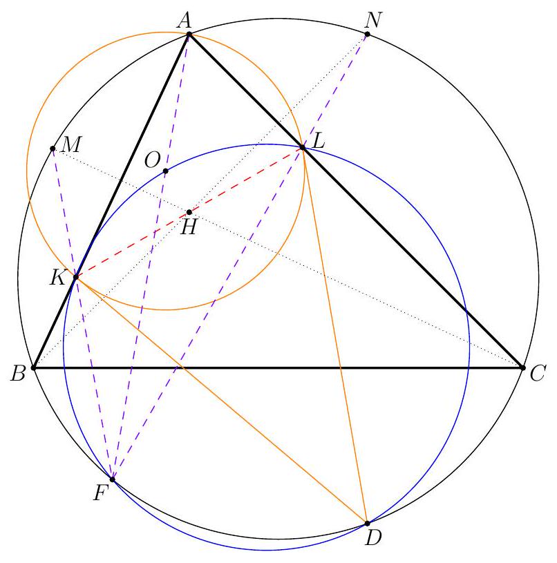 \angle N F O=\angle N F A=\angle N B A=\frac{\pi}{2}-\angle B A C=\frac{\pi}{2}-\angle K A L