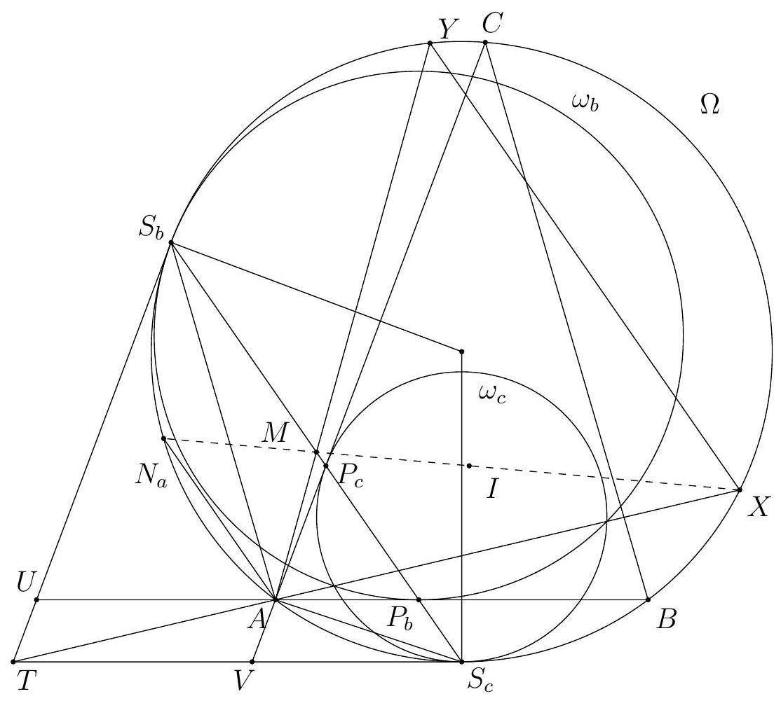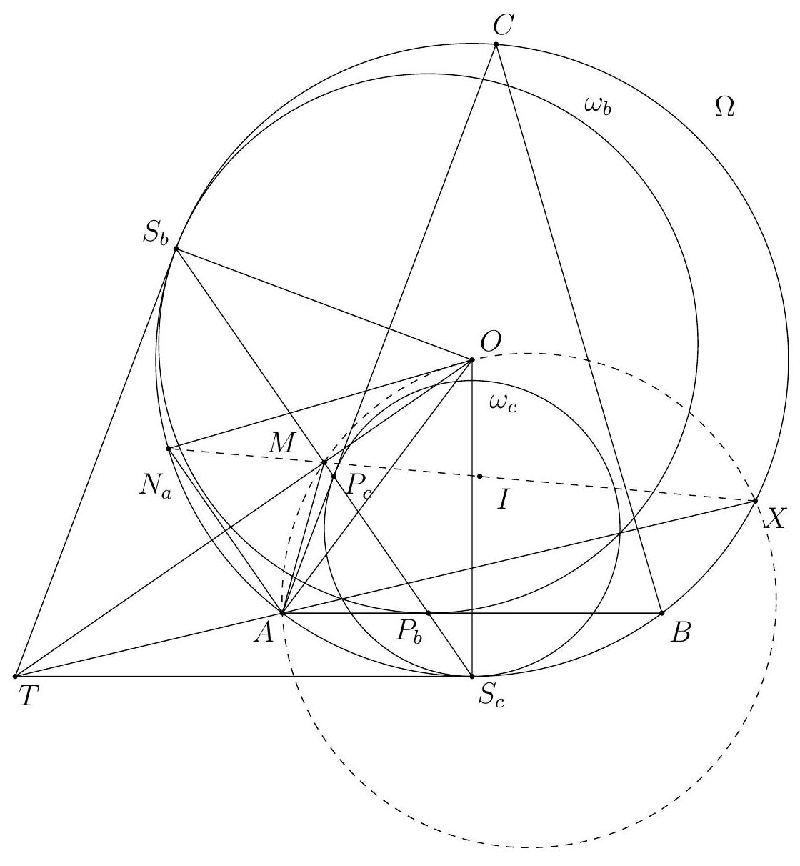 En chasse aux angles : $\left(B^{\prime} T, T C\right)=\left(B^{\prime} T, A T\right)+(A T, T C)$ d'après le relation de Chasles, en utilisant la cocyclicité des points $T, A, B_{A}$ et $B^{\prime}$ ainsi que celle des points $T, A, B$ et $C$, on trouve $\left(B^{\prime} T, A T\right)+(A T, T C)=\left(B^{\prime} B_{A}, A B_{A}\right)+(A B, B C)=\left(B^{\prime} B_{A}, A B\right)+(A B, B C)=$ $\left(B^{\prime} B_{A}, B C\right)=\left(B^{\prime} B_{C}, B_{C} C\right)$, ainsi $\left(B^{\prime} T, T C\right)=\left(B^{\prime} B_{C}, B_{C} C\right)$, donc les points $T, B^{\prime}, B_{C}$ et $C$ sont cocycliques, ce qui conclut la preuve du lemme.