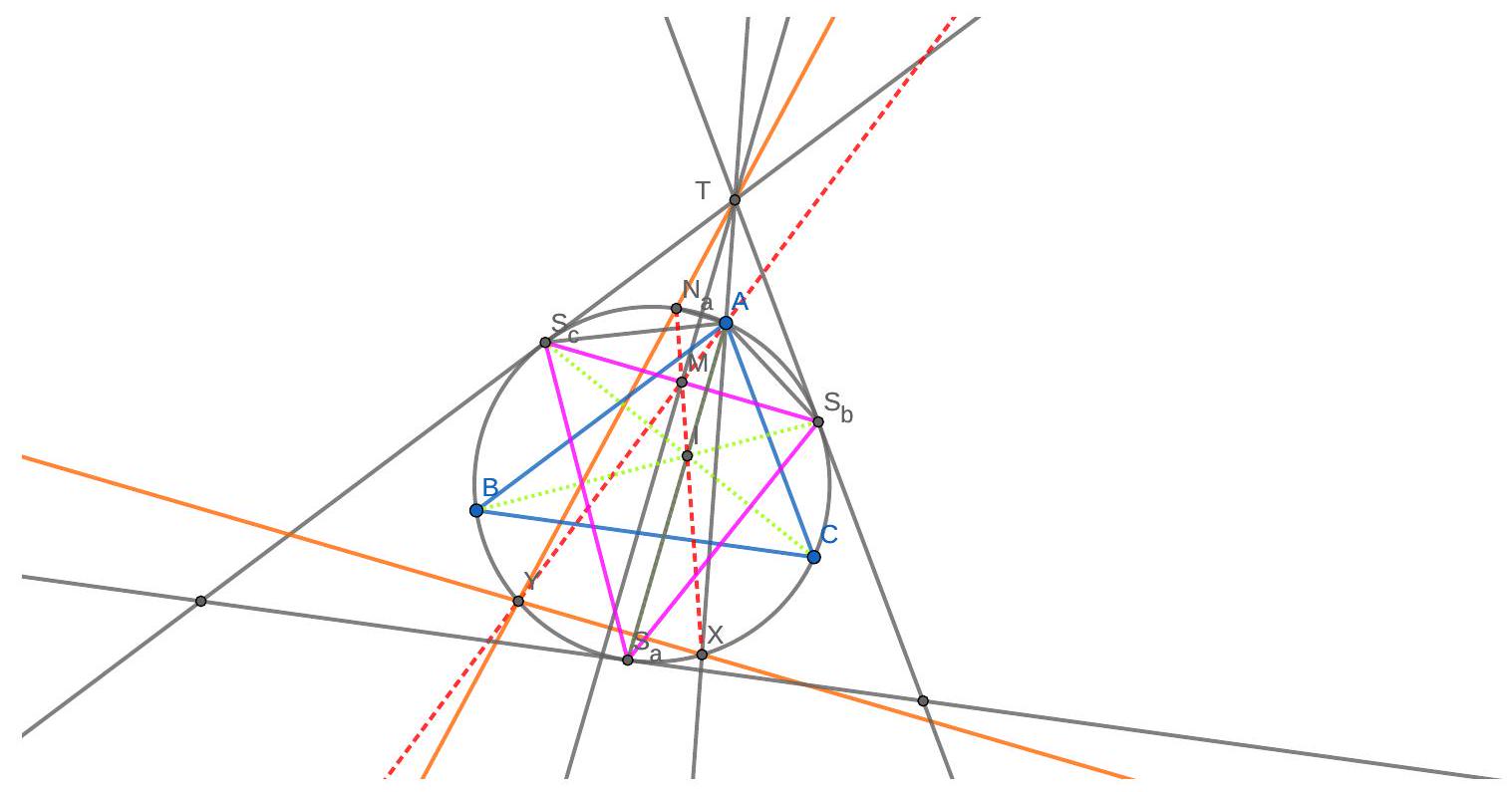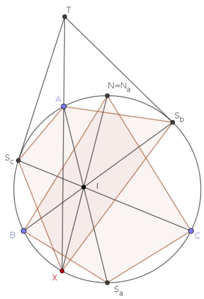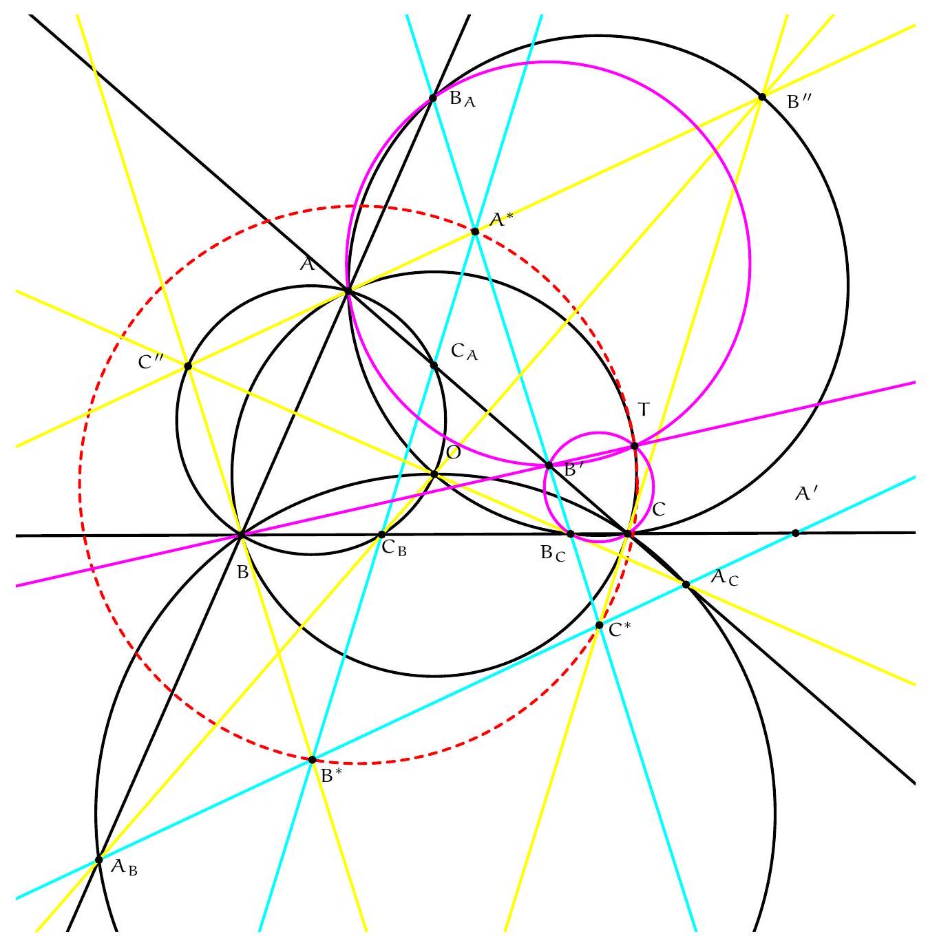 On note $T$ l'intersection des cercles circonscrits de $A B_{A} B^{\prime}$ et $A B C$, on veut démontrer au final que $T$ est le point de tangence des cercles $A^{*} B^{*} C^{*}$ et $A B C$.