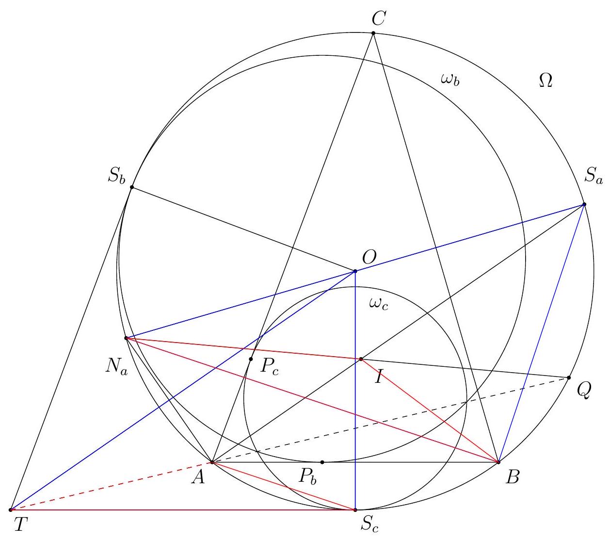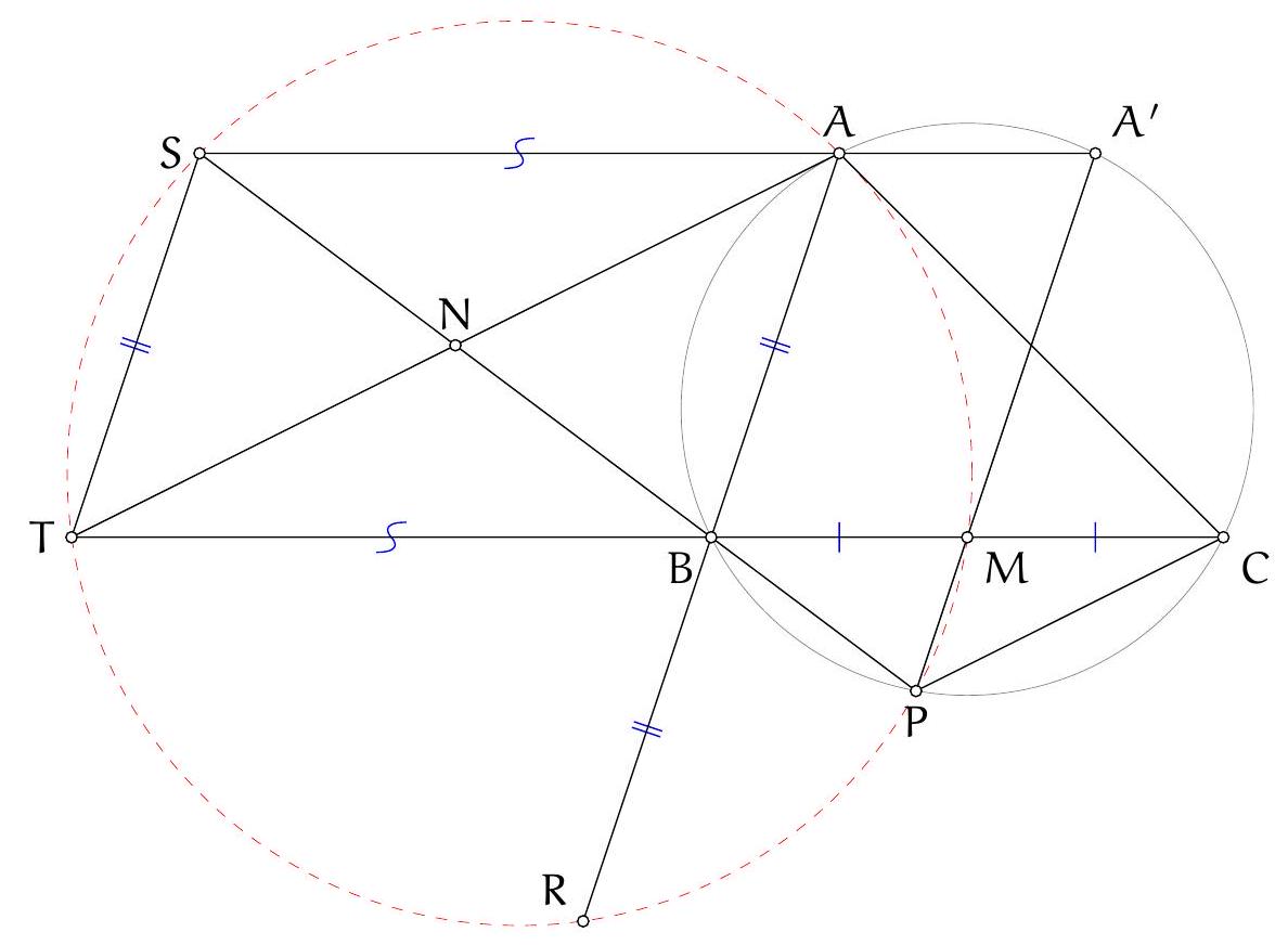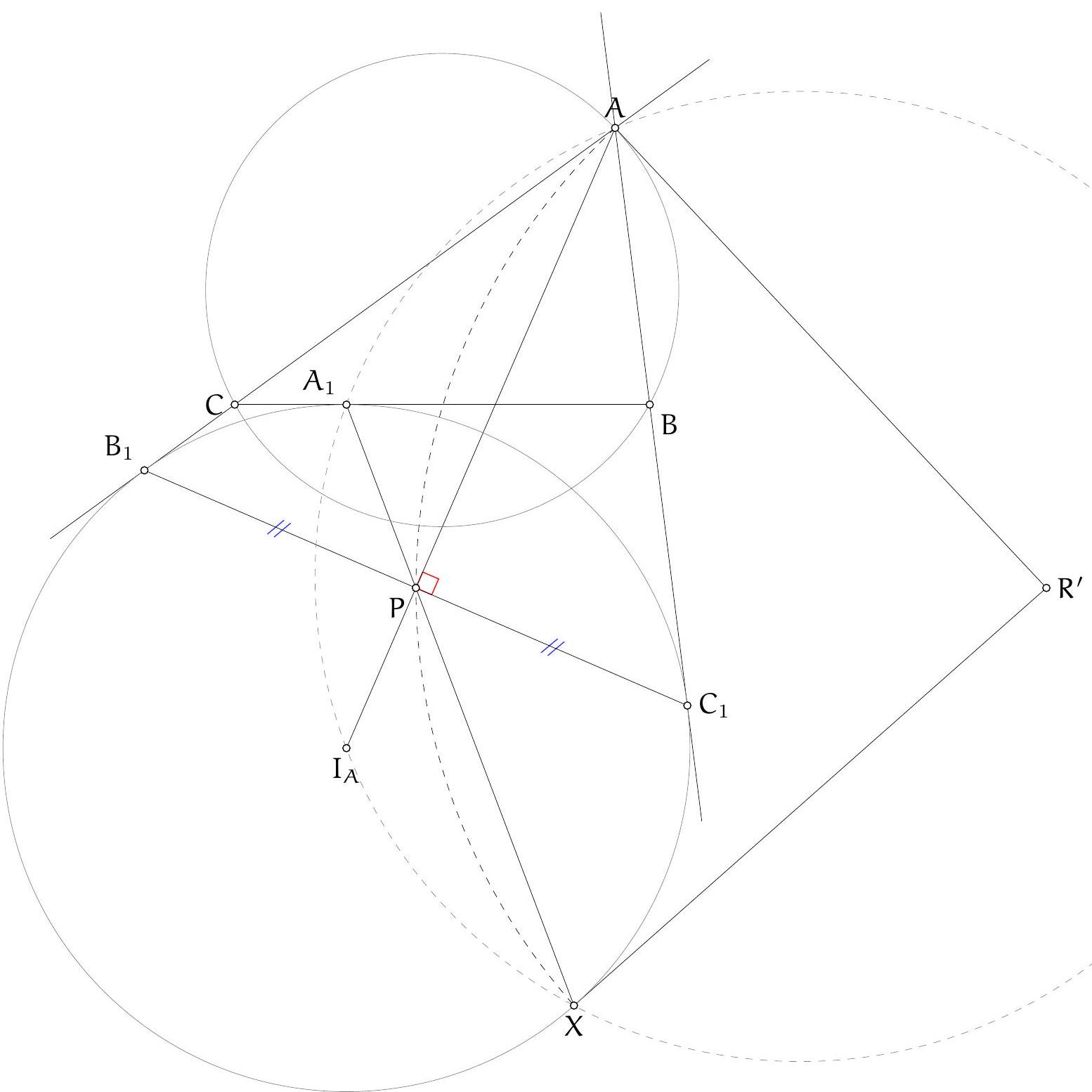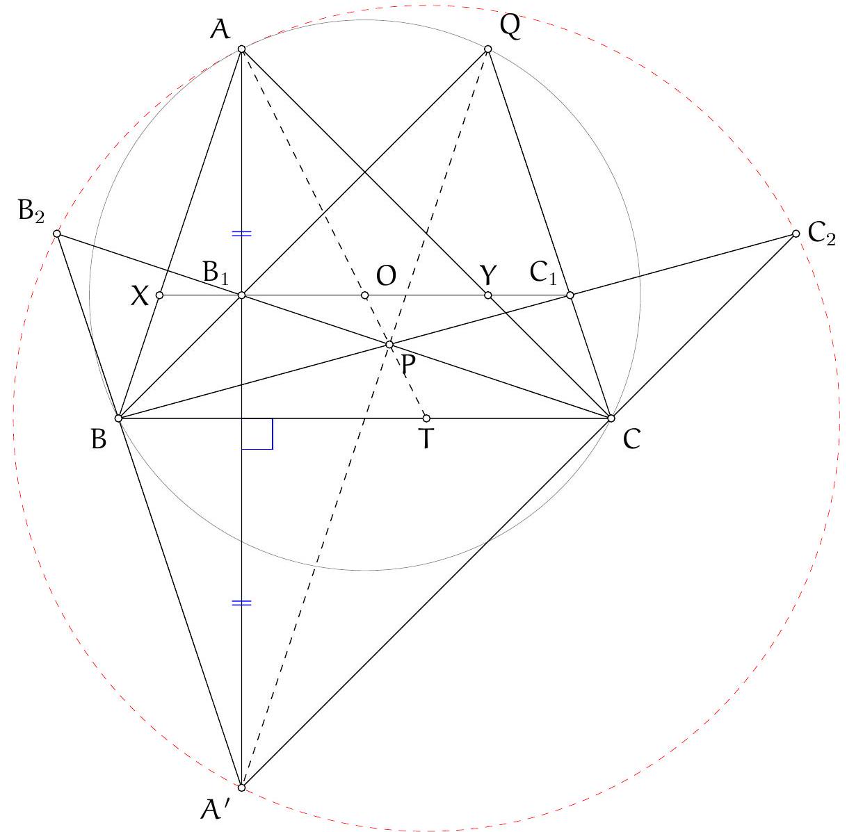 On regarde les cercles $B^{\prime} T C B_{C}, A B^{\prime} T B_{A}$ et $A C B_{A} B_{C}$ (tous ces points sont cocycliques d'après le lemme précédent), leurs axes radicaux sont ( $B^{\prime} T$ ), ( $B_{A} A$ ) et ( $B_{C} C$ ), ce qui montre par concourance des axes radicaux que les points $B, B^{\prime}$ et $T$ sont alignés.