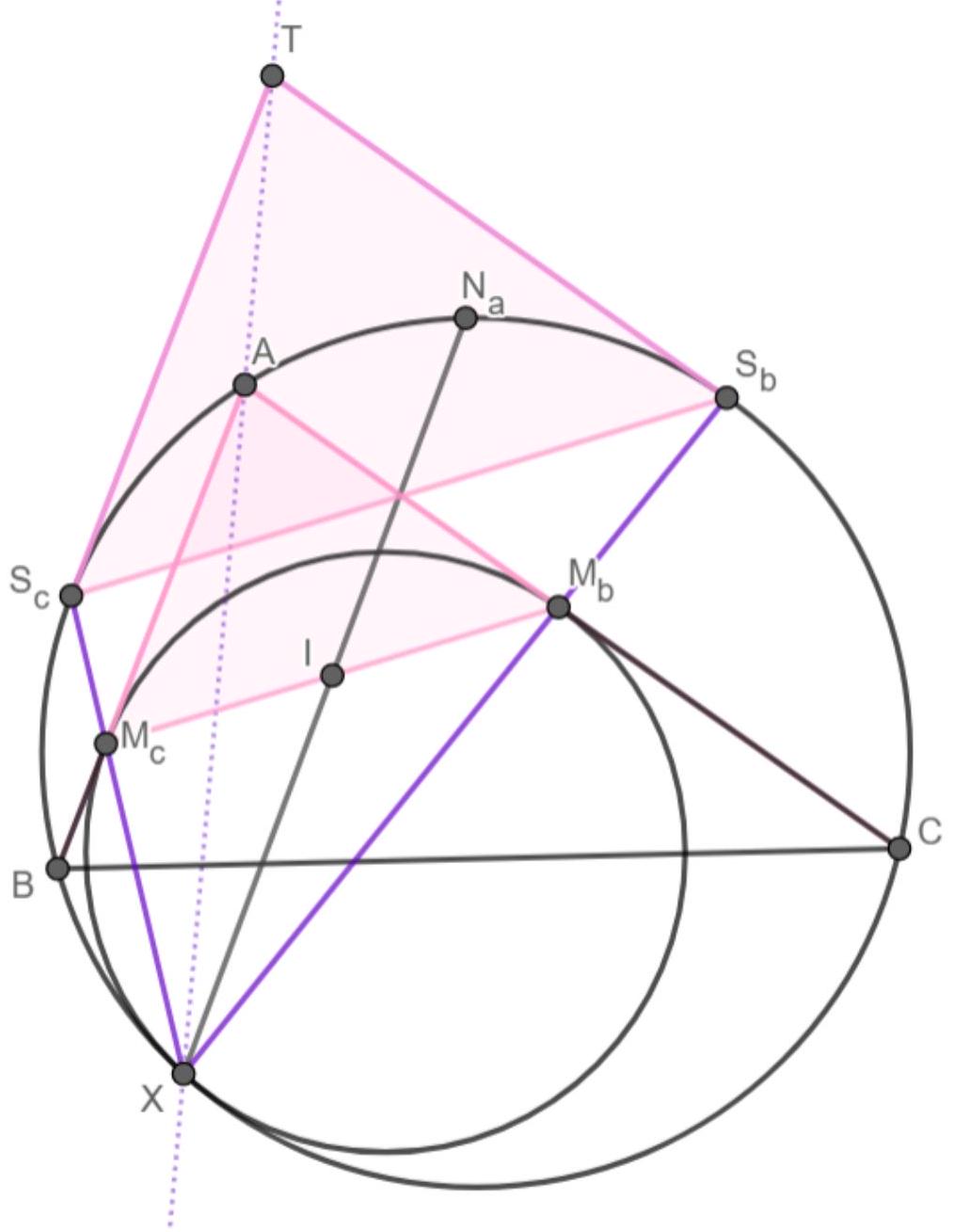 Alors comme $\left(M_{B} M_{C}\right) / /(B C)$, on trouve $\widehat{M_{B} X C}=\widehat{B C D}=\widehat{B A D}=\frac{\alpha}{2}$, l'avant-dernière égalité découle du fait que les points $A, B, C$ et $D$ sont cocycliques et que $D$ est le pôle sud de $A$ dans le triangle $A B C$. On calcule maintenant que $\widehat{C A Z}=90-\frac{\alpha}{2}, Z$ et $M_{B}$ sont sur la médiatrice de $[A C]$ donc $\left(Z M_{B}\right) \perp(A C)$, et on trouve alors $\widehat{A Z M_{B}}=\widehat{C_{Z M}}=\frac{\alpha}{2}$, mais alors $\widehat{C_{Z M}}=\widehat{C_{B M}}$, ce qui montre que les points $Z, M_{B}, C$ et $X$ sont cocycliques.