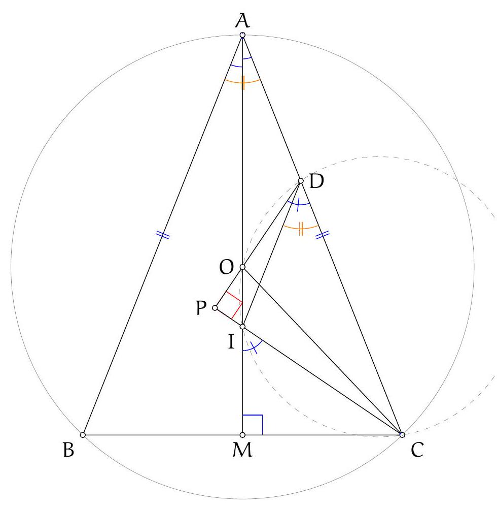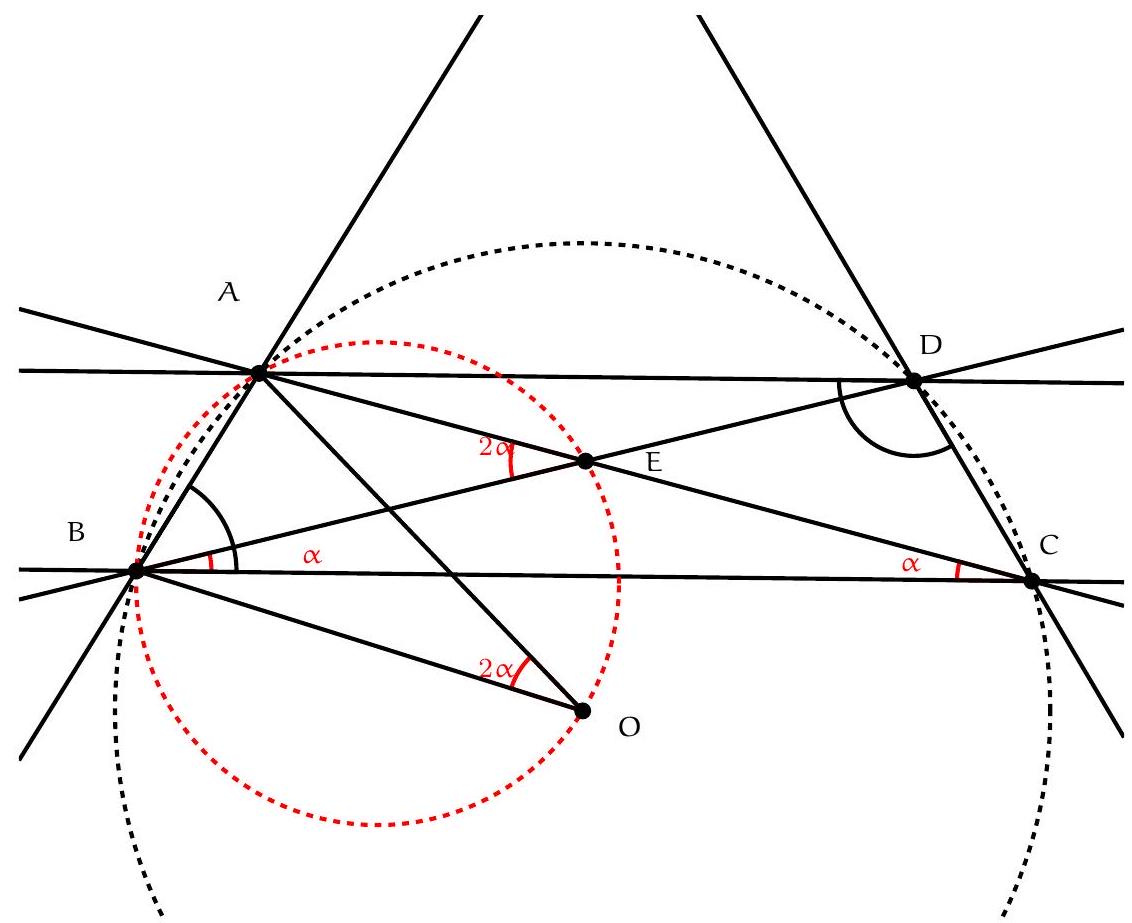On note $\alpha=\widehat{B A C}$, on pose $M_{B}$ le milieu de $[A B]$ et $M_{C}$ le milieu de $[A C]$. On note $X$ l'intersection des droites $\left(M_{B} M_{C}\right)$ et (DC).