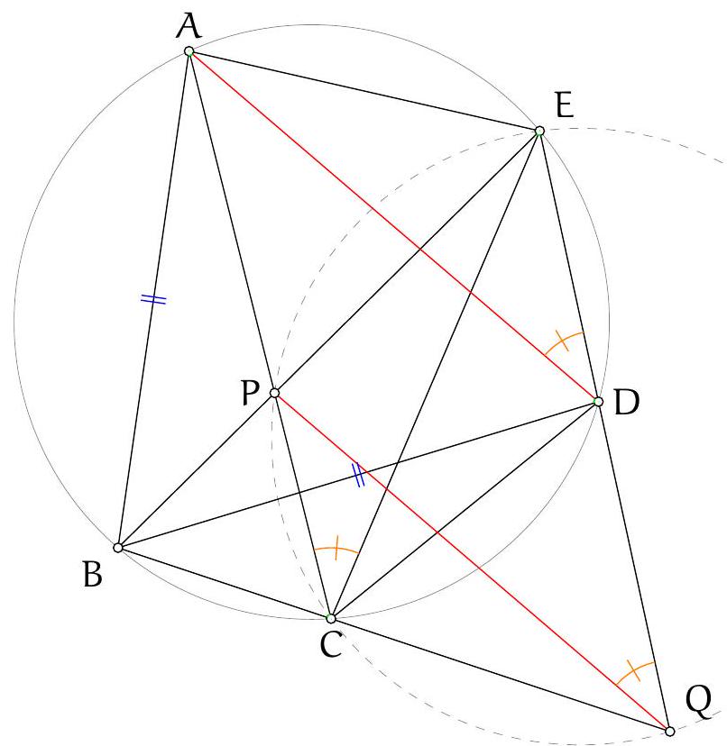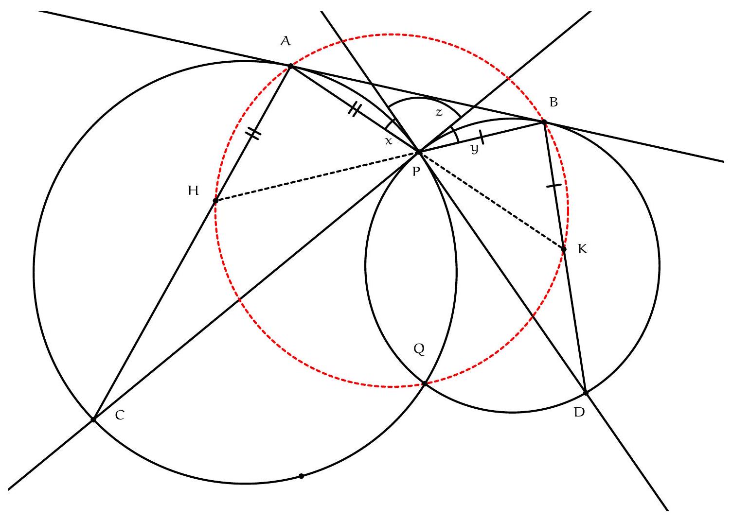 Soit $\omega_{1}$ et $\omega_{2}$ deux cercles qui se coupent en $P$ et $Q$. On suppose que la tangente commune à $\omega_{1}$ et $\omega_{2}$, la plus proche de P , touche les cercles $\omega_{1}$ et $\omega_{2}$ en $A$ et $B$ respectivement. Les tangentes en $P$ aux cercles $\omega_{1}$ et $\omega_{2}$ recoupe $\omega_{2}$ et $\omega_{1}$ en $D$ et $C$ respectivement. On pose $H$ et $K$ sur les segments $[A C]$ et $[B D]$ de tel sorte que $A H=A P$ et $B K=B P$. Montrer que les points $A, B, K, Q$ et $H$ sont sur le même cercle.