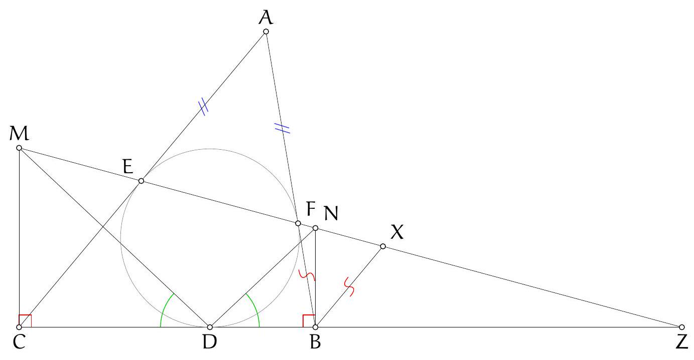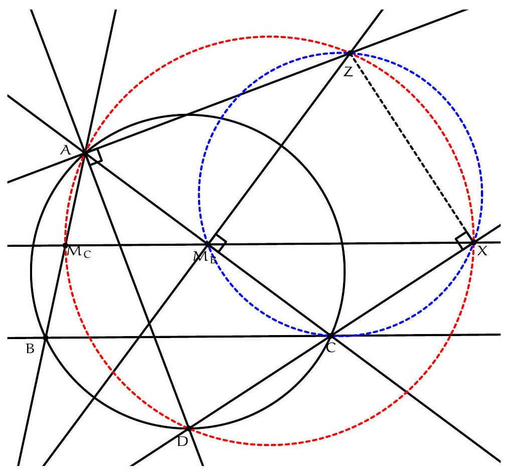 Comme $Z, M_{B}, C$ et $X$ sont cocycliques et $\widehat{Z M_{B} C}=90$ on doit avoir $\widehat{Z C X}=90$. On a de plus, $\widehat{D A Z}=90$, ce qui montre que les points $A, Z, X$ et $D$ sont cocycliques.