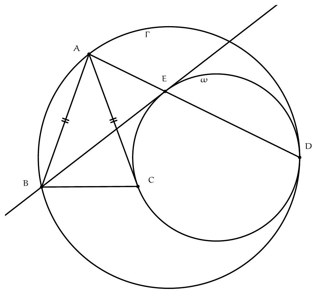 On note $I_{A}$ l'inversion de centre $A$ et de rayon $r=A B=A C$, ainsi, $B$ et $C$ sont fixe par $I_{A}$, la puissance de $A$ par rapport au cercle $\omega$ est exactement le rayon au carré donc les cercle $\omega$ est fixe par inversion. Cela montre que $D$ et $E$ sont échangés dans $I_{A}$. Mais alors le cercle $\Gamma$ passant par $A, B$ et $D$ va être envoyé sur une droite passant par $B$ et $E$ et tangente au cercle $\omega$, cela conclut.