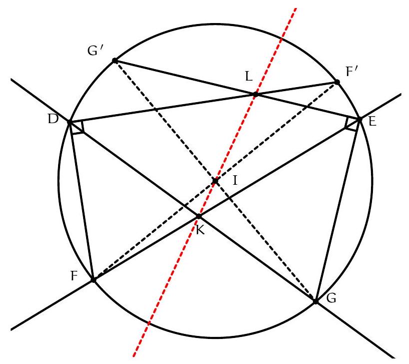 On intersecte maintenant la droite ( EL ) avec le cercle EDFG en $\mathrm{G}^{\prime}$, et la droite ( DL ) également avec le cercle EDG et en $F^{\prime}$. En sachant que $\widehat{L^{\prime} E L}=90$ et $\widehat{L^{\prime} D L}=90$ on trouve que $\mathrm{G}^{\prime}$ (resp. $\mathrm{D}^{\prime}$ ) est le point diamétralement opposé à G (resp. D) dans le cercle EDFG, donc I est l'intersection des droites $\mathrm{GG}^{\prime}$ et $\mathrm{DD}^{\prime}$. On numérote les points $\mathrm{G}^{\prime}, \mathrm{G}, \mathrm{D}, \mathrm{F}^{\prime}, \mathrm{F}$ et $E$ comme 1, 2, 3, 4,5 et 6 et appliquer Pascal comme les 6 points sont sur le même cercle, alors $\left(G^{\prime} G\right) \cap\left(F^{\prime} F\right),(G D) \cap(F E)$ et $\left(\mathrm{DF}^{\prime}\right) \cap\left(E G^{\prime}\right)((12) \cap(45),(23) \cap(56)$ et $(34) \cap(61))$ sont alignés ce qui démontre bien que les points K, I et L sont alignés.
