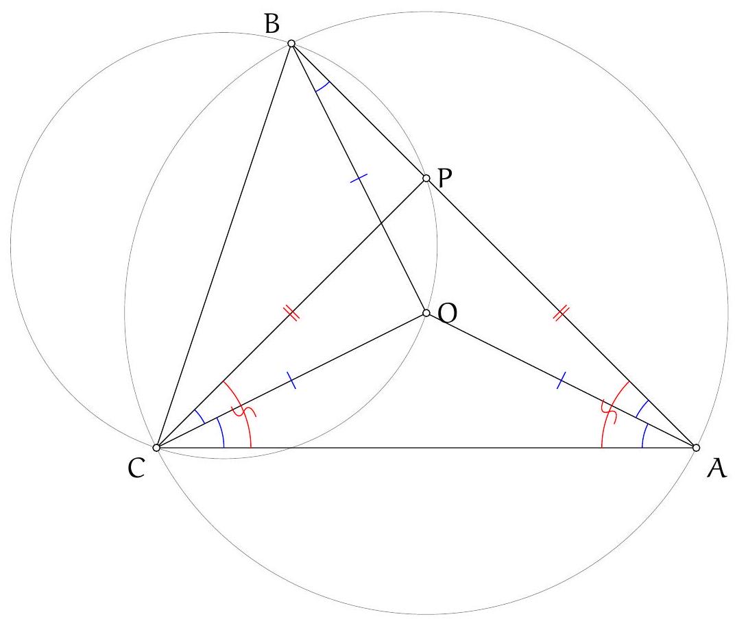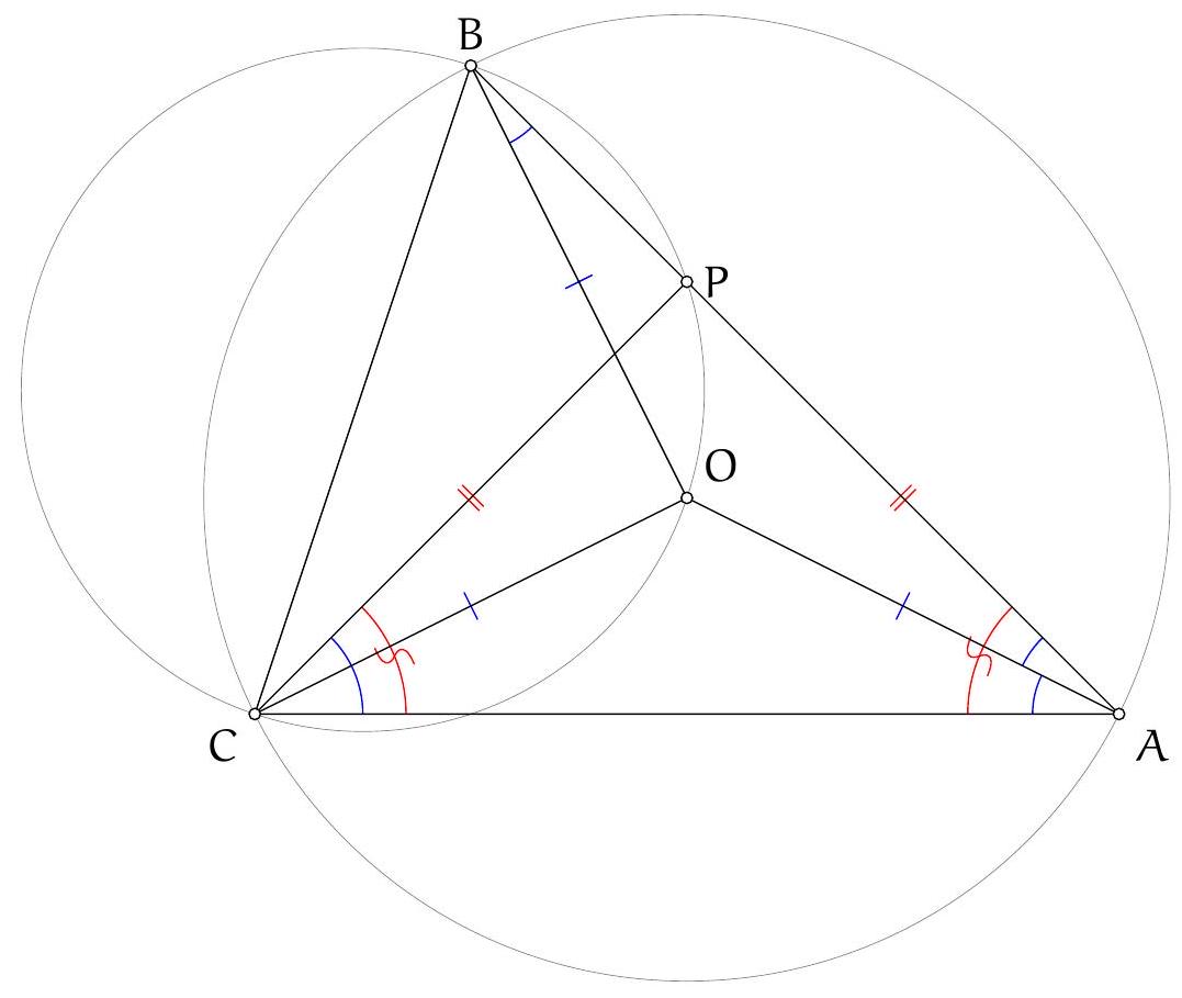 Par angle à la tangente l'angle $\widehat{C A P}=z$, mais $A H=A P$ donc les triangle $A H P$ est isocèle en $A$, et $\widehat{A H P}=\widehat{A P H}=\frac{180-z}{2}=\frac{2 x+2 y}{2}=x+y$, alors l'angle $\widehat{\mathrm{HPB}}=\widehat{\mathrm{HPA}}+\widehat{\mathrm{APB}}=x+y+x+z+y=$ $2 x+2 y+z=180$, ce qui montre bien que les points $H, P$ et $B$ sont alignés. Le raisonnement symétrique montre que $K, P$ et $A$ sont alignés.