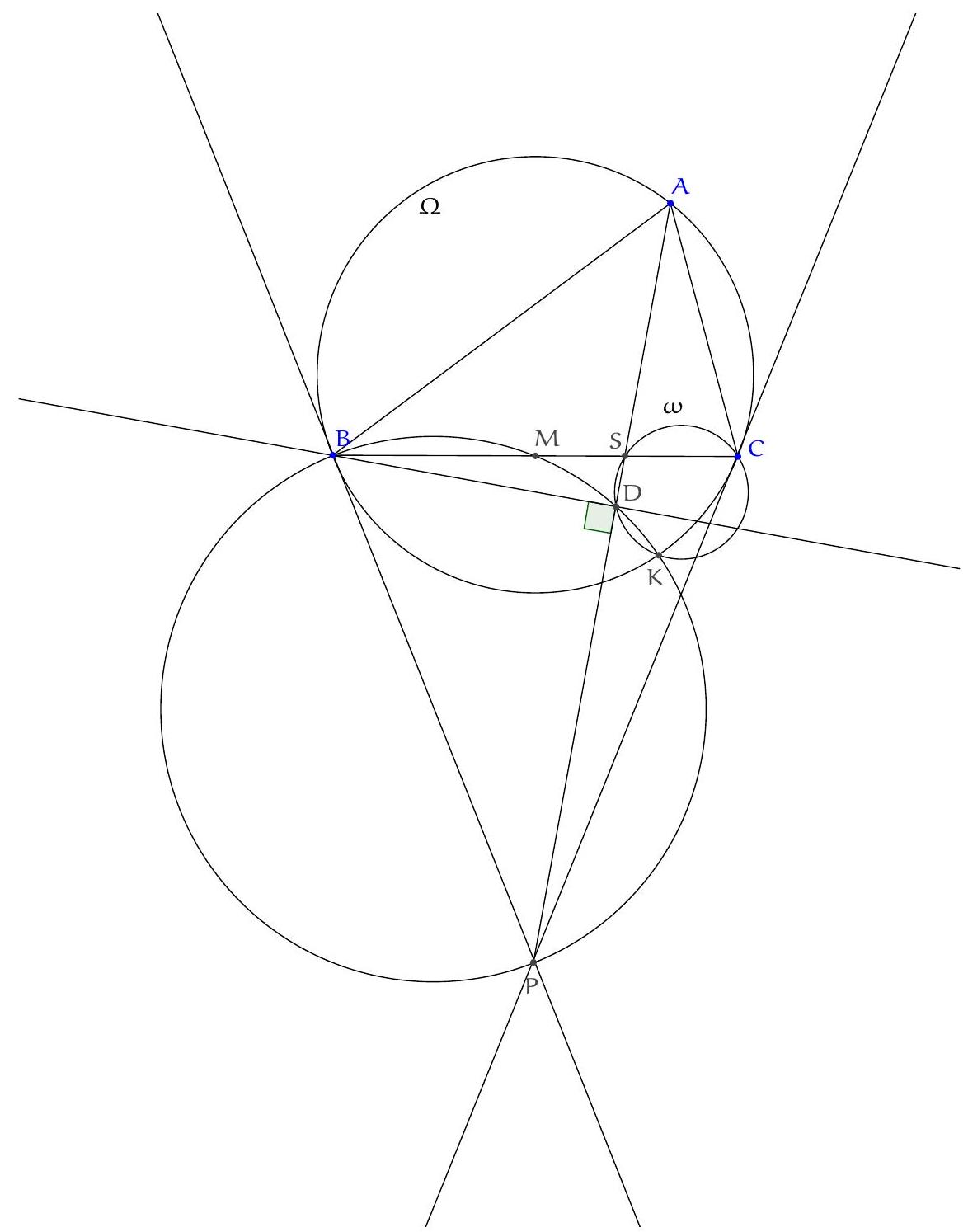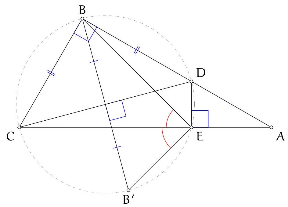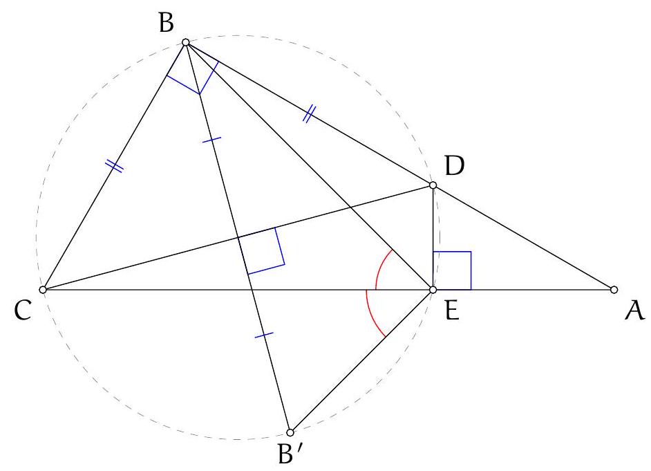 On a $\widehat{B D A}=x$ et $\widehat{A B B^{\prime}}=x$. Par isocélité de $A B B^{\prime}$ en $A$, on trouve $\widehat{A B^{\prime} B}=x$. Donc les triangles $A B D$ et $A E B$ sont semblables, on trouve alors $A B^{2}=A E \times A D$. Donc $E^{\prime}$ est sur $\omega$, ce qui montre que $E^{\prime}=E$. L'homothetie de centre $D$ qui envoie le cercle $\omega$ sur le cercle $\Gamma$ envoie ainsi le point $E$ sur le point $A$ et donc la tangente en $E$ à $\omega$ sur la tangente en $A$ à $\Gamma$ ?. Il se trouve que comme $A B=A B^{\prime}$, la tangente en $A$ à $\Gamma$ est parallèle à la droite $\left(B^{\prime}\right)$, mais la tangente en $E$ à $\omega$ doit être parallèle à la tangente en $A$ à $\Gamma$. Cela montre que la tangente en $E$ à $\omega$ et ( $\left.\mathrm{BB}^{\prime}\right)$ ne sont en fait qu'une seule et même droite et cela conclut.