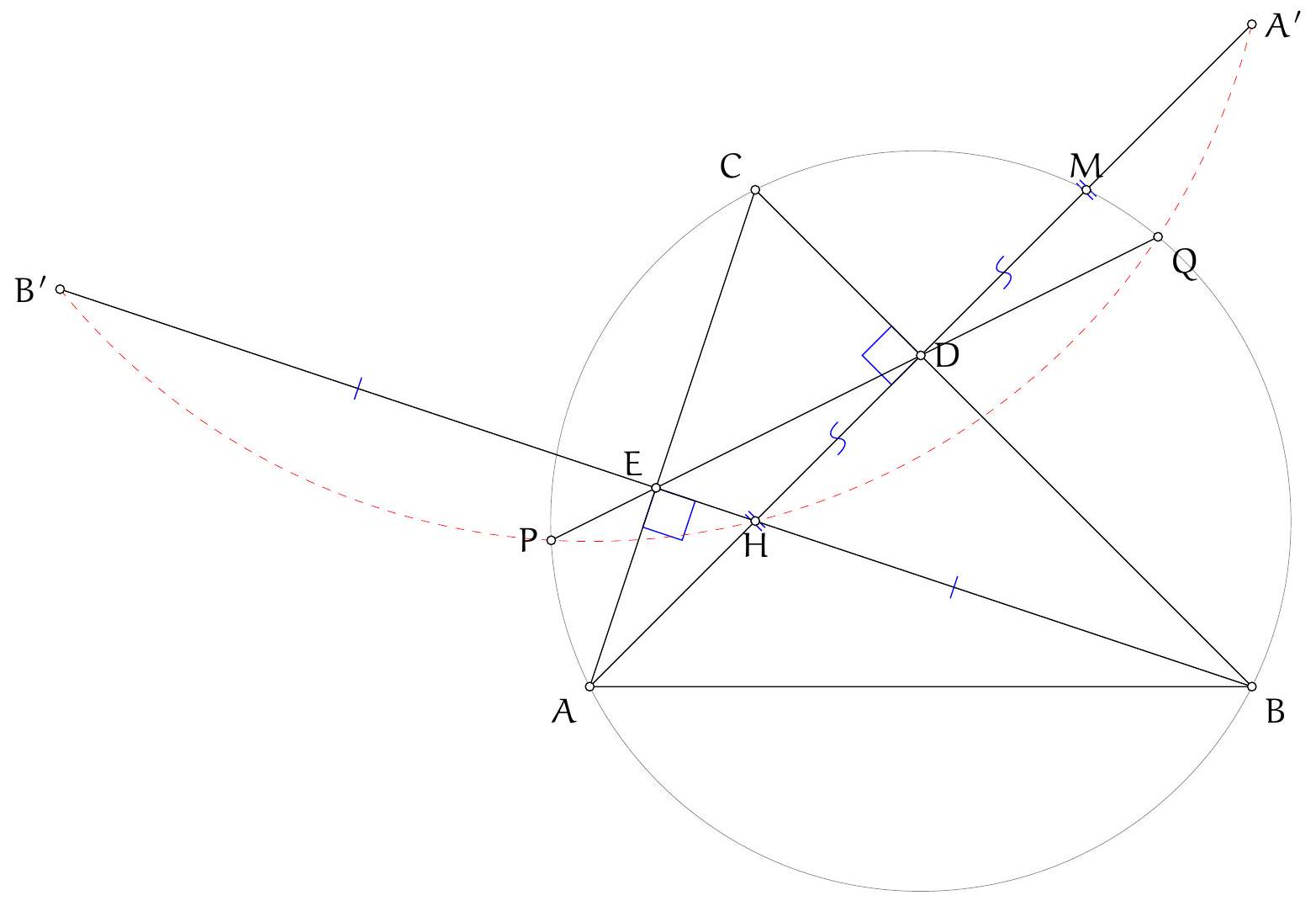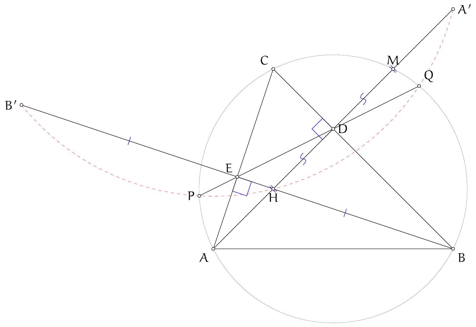 On a trouvé dans la preuve du lemme que $\widehat{A H B}=\widehat{A H P}=x+y$, mais alors par symétrie $\widehat{B K A}=\widehat{B K P}=x+y$, et par angle à la tangente, $\widehat{P Q A}=x$ et $\widehat{P Q B}=y$, donc $\widehat{A Q B}=x+y$, on a ainsi $\widehat{A H B}=\widehat{B K A}=\widehat{B Q A}$ ce qui montre bien que les points $A, H, Q, K$ et $P$ sont cocycliques.