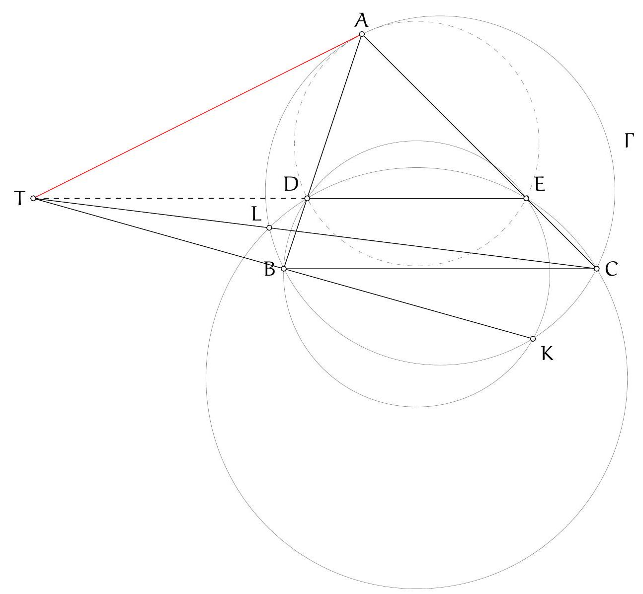 Let $B^{\prime}$ and $C^{\prime}$ be two points on the rays $[A D]$ and $[A C]$ beyond $D$ and $E$ such that $\left(B^{\prime} C^{\prime}\right) \parallel (B C)$ and that $\left(B^{\prime} C^{\prime}\right)$ is tangent to $\omega$ at $L^{\prime}$.
