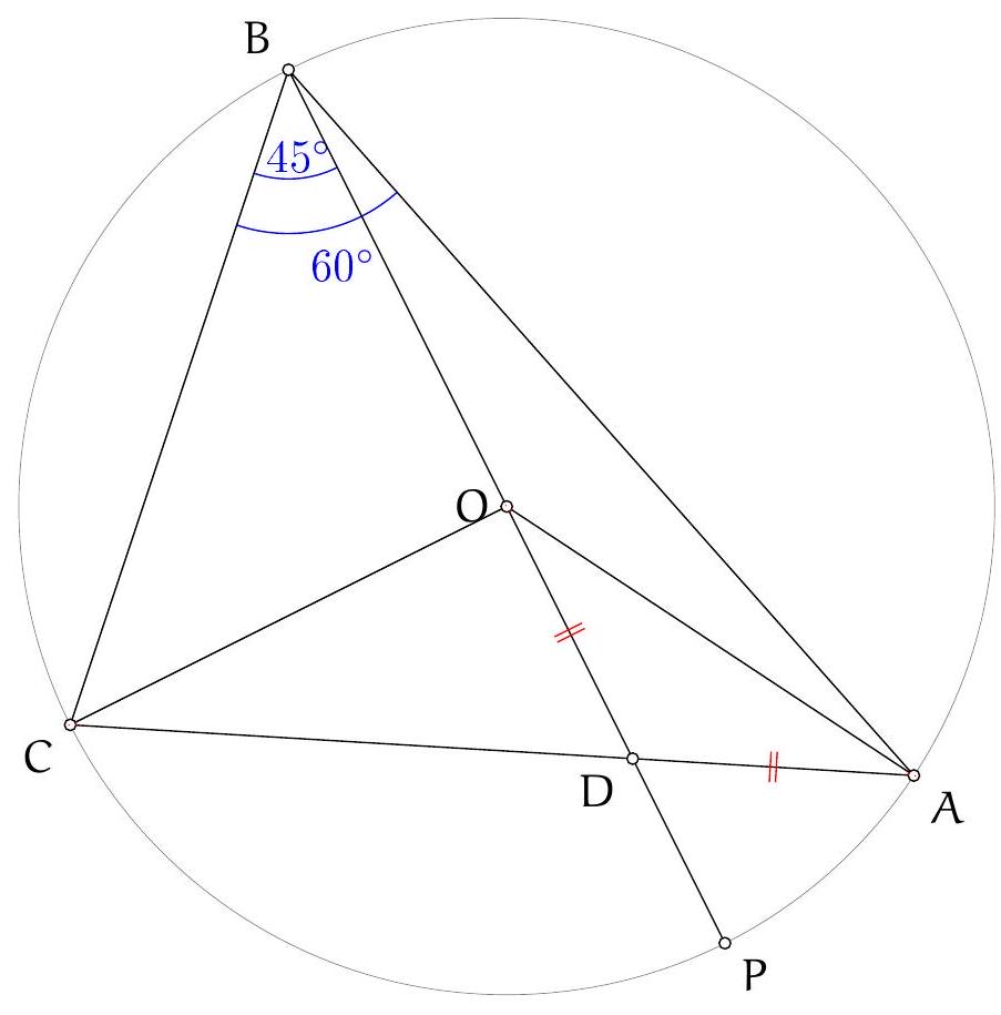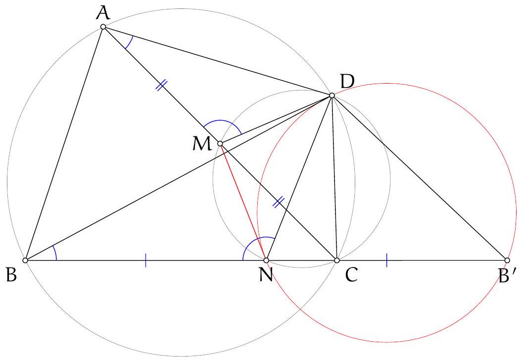 On effectue alors $T=S_{M_{B}, 180,1}+S_{Z, \alpha, 1}+S_{D, 180-\alpha,}$, cette transformation est également une similitude directe de rapport $1 \times 1 \times 1$ et d'angle $180+180-\alpha+\alpha=360$, le résultat est donc une translation, mais $T$ envoie $B$ sur $B$, une translation qui a un point fixe est l'identité donc $T$ est en fait l'identité. Mais la transformation $T$ envoie $D$ sur $\mathrm{D}^{\prime}$ puis $\mathrm{D}^{\prime}$ sur $\mathrm{D}^{\prime \prime}$ et $\mathrm{D}^{\prime \prime}$ sur $\mathrm{D}^{\prime \prime \prime}=\mathrm{D}, \mathrm{D}^{\prime \prime}$ est envoyé sur $\mathrm{D}^{\prime \prime \prime}=\mathrm{D}$ par la similitude de centre D donc $\mathrm{D}^{\prime \prime}=\mathrm{D}^{\prime \prime \prime}=\mathrm{D}$, ainsi la similitude de centre $Z$ envoie $D^{\prime}$ sur $D$, donc en particulier $Z D^{\prime}=Z D$ et $\widehat{D^{\prime} Z D}=\alpha$. Dans le triangle $A^{\prime} D Z$, le point $M_{B}$ est le pied de la hauteur, bissectrice, etc..., donc en particulier, $\widehat{M_{B} Z C}=\frac{\alpha}{2}=\widehat{M_{B} A D}$, ce qui conclut.