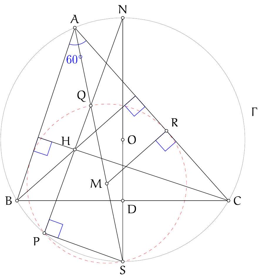 Claim. $\angle N F M=\pi-2 \alpha$, so $F$ lies on the circumcircle.