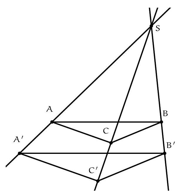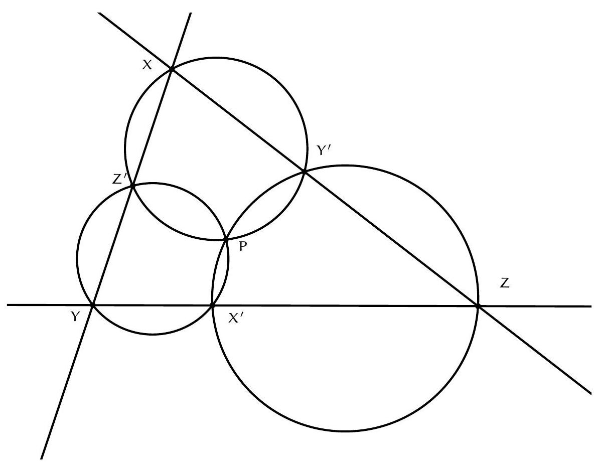 Soit $X Y Z$ un triangle, $X^{\prime}, Y^{\prime}$ et $Z^{\prime}$ des points sur les côtés $Y Z, X Y$ et $Z X$, alors les cercles $Y X^{\prime} Z^{\prime}$, $X Y^{\prime} Z^{\prime}$ et $X^{\prime} Y^{\prime} Z$ sont concourants en $P$.