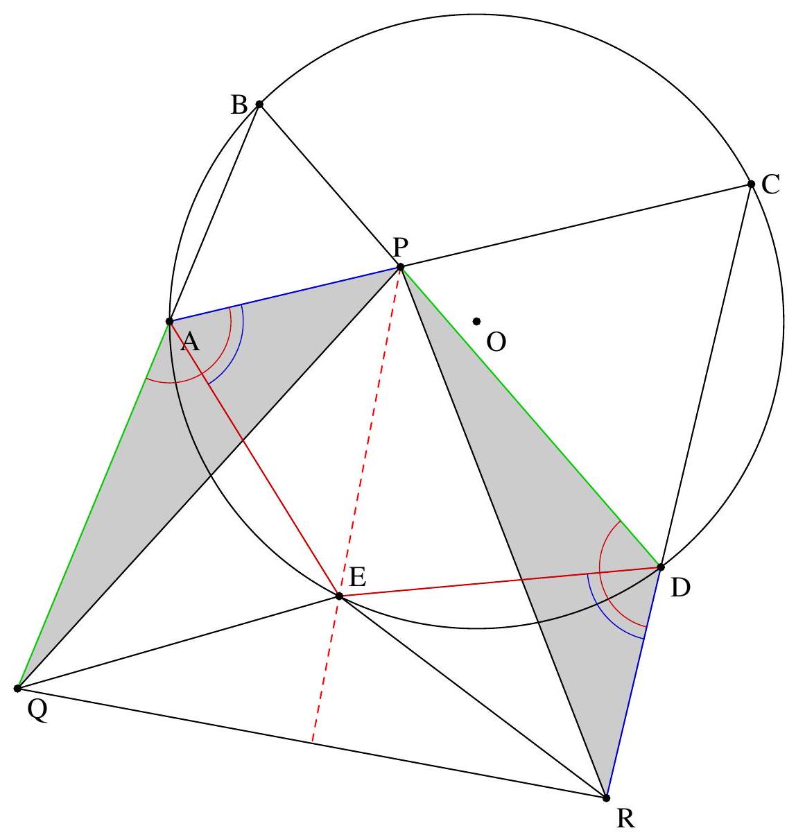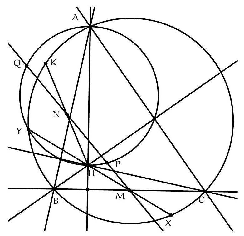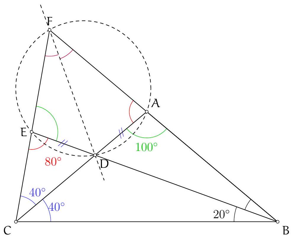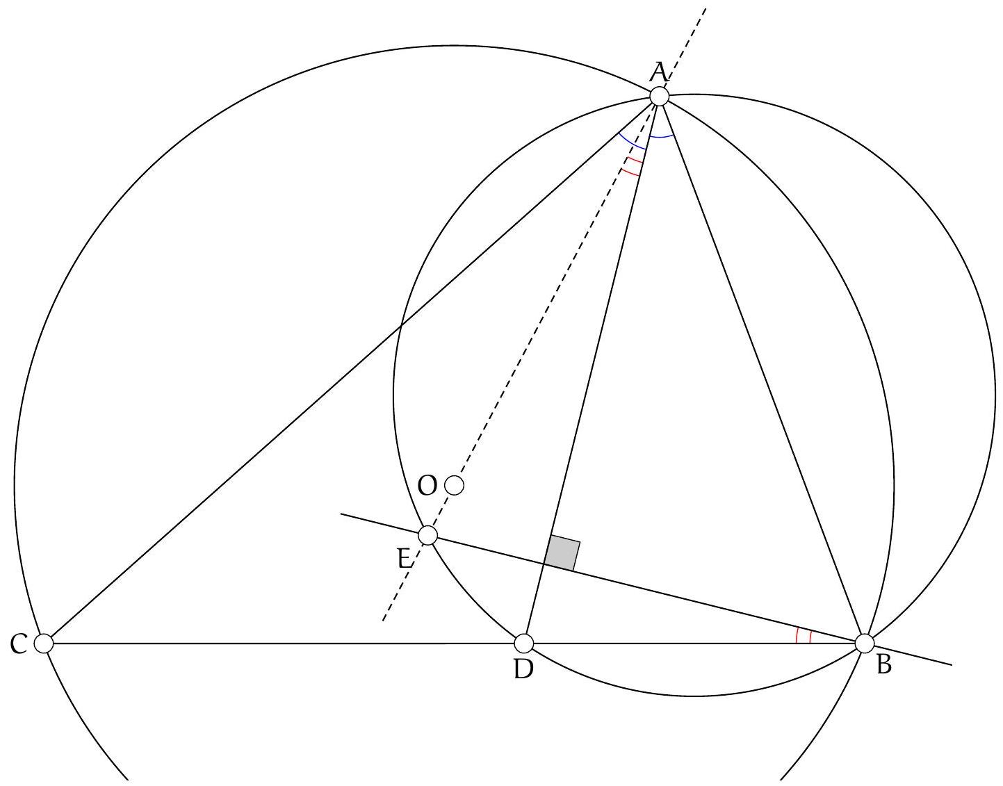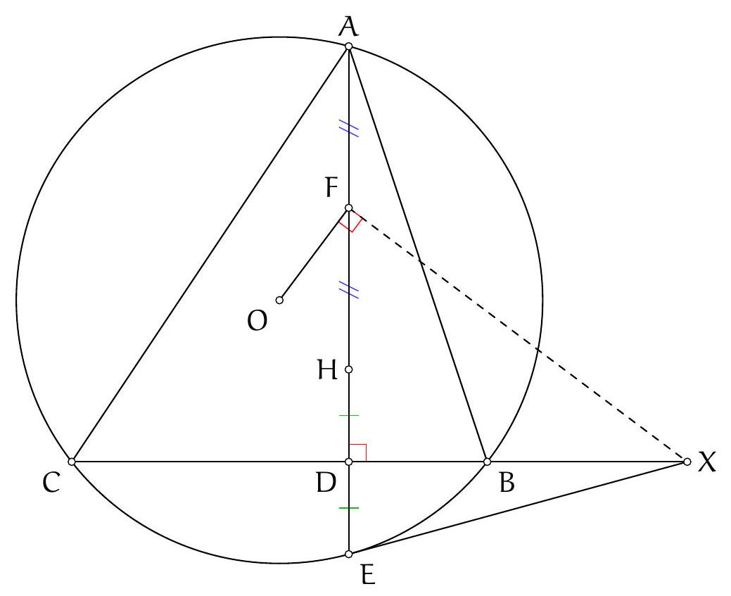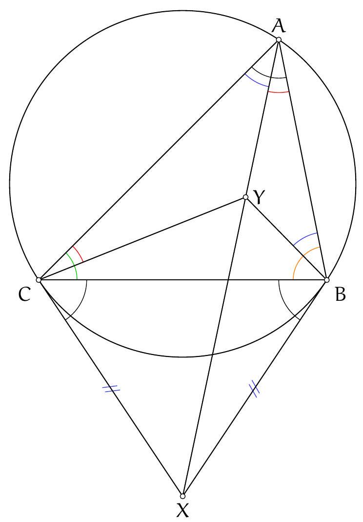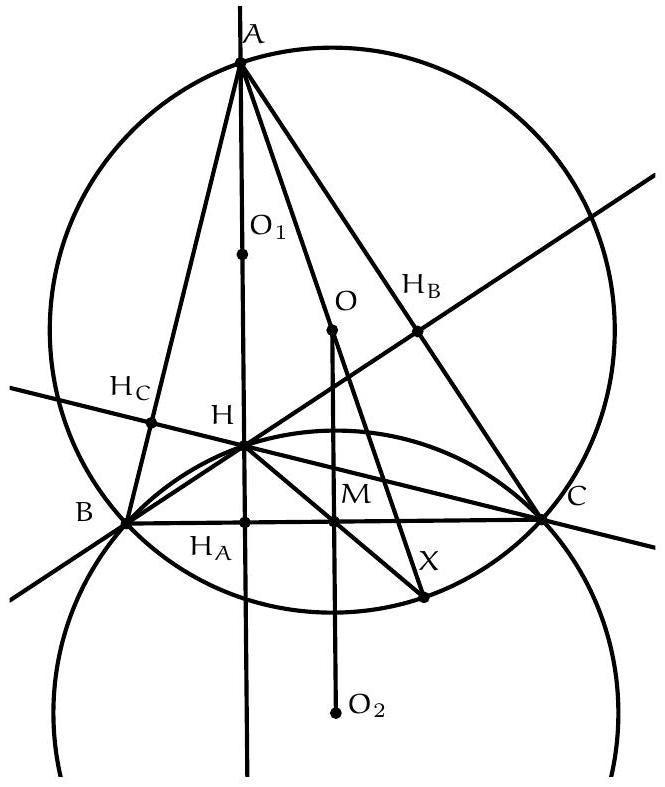 On a $\left(C_{A} O, B C\right)=\left(C_{A} O, A C\right)+(A C, B C)=\left(C_{A} O, A C_{A}\right)+(A C, B C)=(A B, A O)+(A C, B C)=$ 90 (car la hauteur issue d'un sommet d'un triangle et la droite reliant ce somet avec le centre du cercle circonscrit sont conjugués isogonales), ce qui montre que ( $C_{A} O$ ) et ( $B C$ ) sont perpendiculaires, mais O est sur le médiatrice de $[\mathrm{BC}]$ donc $\mathrm{C}_{A}$ également.