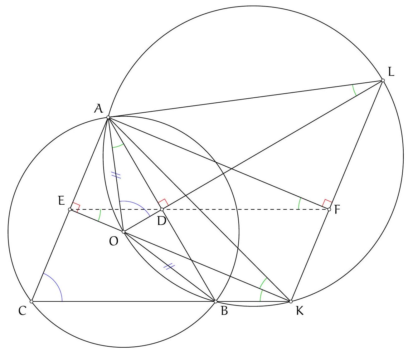 $\left(C_{B} A, A B_{C}\right)=\left(C_{B} A, A O\right)+\left(A O, A B_{C}\right)=\left(C_{B} B, B O\right)+\left(C O, C B_{C}\right)$ par cocyclicité des points $\mathrm{C}_{\mathrm{B}} \mathrm{BAO}$ et $\mathrm{AOB}_{\mathrm{C}} \mathrm{C},\left(\mathrm{C}_{\mathrm{B}} \mathrm{B}, \mathrm{BO}\right)+\left(\mathrm{CO}, \mathrm{CB}_{\mathrm{C}}\right)=(\mathrm{CB}, \mathrm{BO})+(\mathrm{CO}, \mathrm{CB})=(\mathrm{CO}, \mathrm{BO})=2(\mathrm{CA}, \mathrm{AB})$, donc $\left(C_{B} A, A B_{C}\right)=2(C A, A B)$, on trouve également que $\left(C_{B} A^{*}, A^{*} B_{C}\right)=2(C A, A B)$ d'après le lemme 3.2, ainsi $\left(C_{B} A, A B_{C}\right)=\left(C_{B} A^{*}, A^{*} B_{C}\right)$, ainsi les points $C_{B}, B_{C}, A$ et $A^{*}$ sont cocycliques.