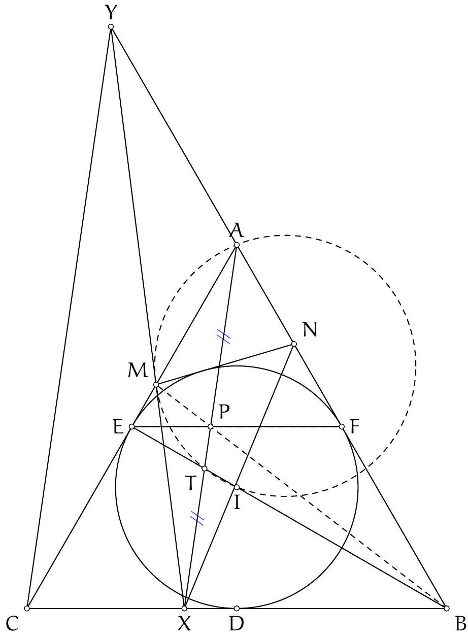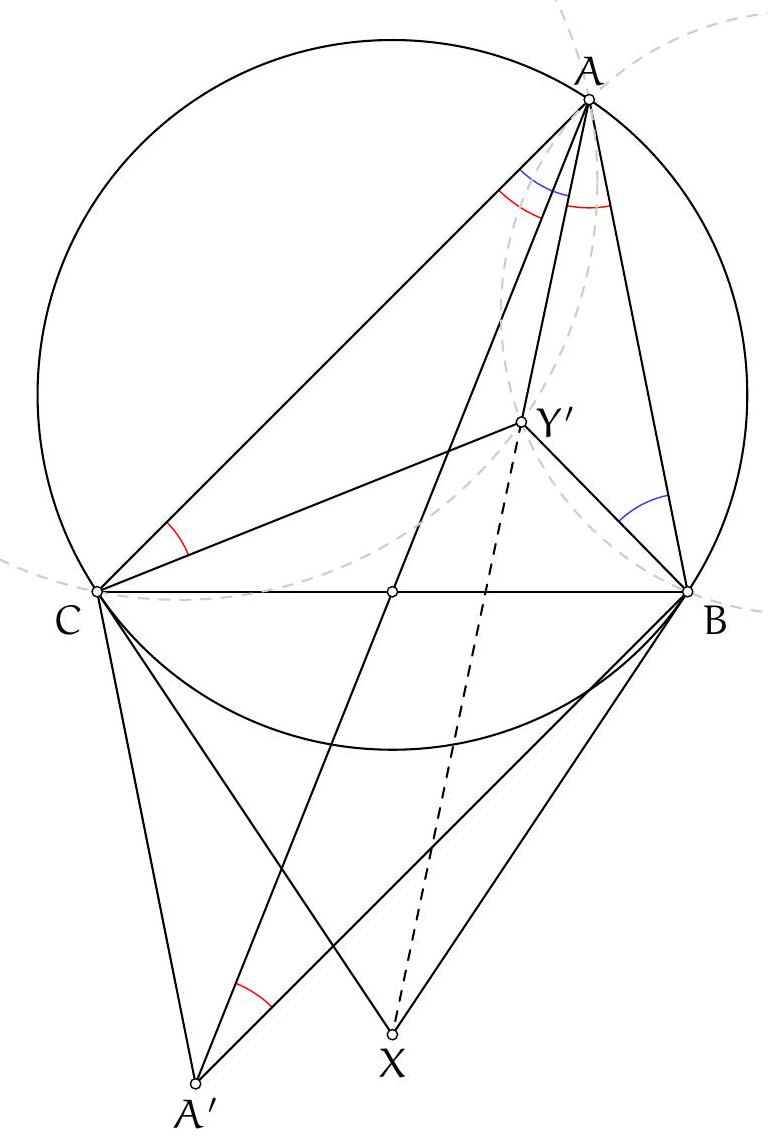 On pose dans un premier temps: $X, Y, Z=A_{C}, B^{\prime}, C^{*}$ et $X^{\prime}, Y^{\prime}, Z^{\prime}=B_{C}, A^{\prime}, C$. Alors les cercles circonscrits de $C A_{C} A^{\prime}, B^{\prime} B_{C} C$ et $B_{C} C^{*} A^{\prime}$ se coupent en $T$, car $T$ est sur les cercles circonscrits $\operatorname{de} C A_{C} A^{\prime}$ et $B^{\prime} B_{C} C$. Ainsi, $T, B_{C}, C^{*}$ et $A^{\prime}$ sont cocycliques.