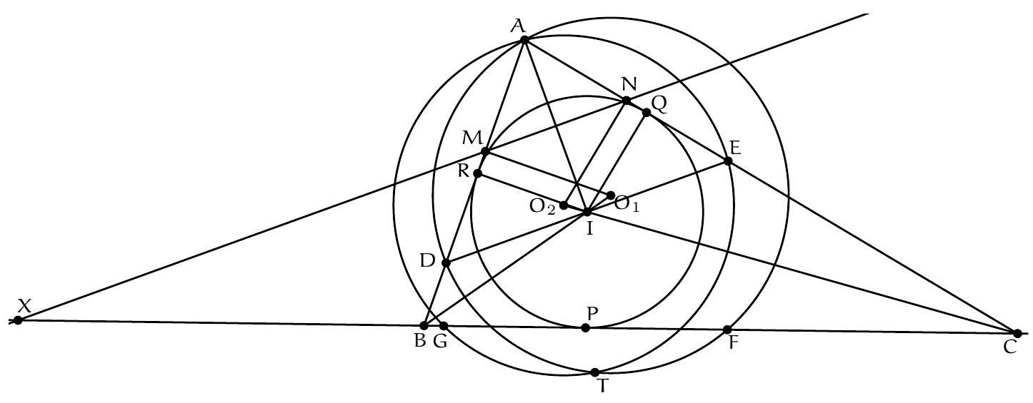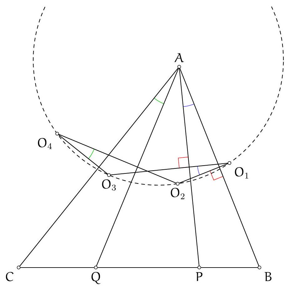 Symmetrically, $B_{A}$ is on the perpendicular bisector of $[B C]$ and thus $O, B_{A}$ and $C_{A}$ are collinear.