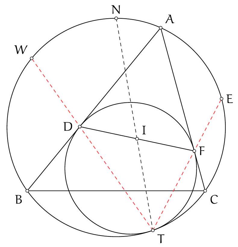 On a $\left(C^{*} T, t\right)=\left(C^{*} T, T C\right)+(T C, t)=\left(C^{*} A_{B}, A_{B} C\right)+(T B, B C)$ (par cocyclicité et angle tangent). Or, $\left(C^{*} A_{B}, A_{B} C\right)=(B A, A C)+(A B, B C)$ par chasse au angle direct, mais $\left(B C^{\prime}, C^{\prime} C_{B}\right)=(B A, A C)+$ $(A B, B C)$ également. Ainsi, $\left(C^{*} \mathrm{~T}, \mathrm{t}\right)=\left(\mathrm{BC}^{\prime}, \mathrm{C}^{\prime} \mathrm{C}_{\mathrm{B}}\right)+(\mathrm{TB}, \mathrm{BC})=\left(\mathrm{BT}, \mathrm{TC}_{\mathrm{B}}\right)+(\mathrm{TB}, \mathrm{BC})=$ $\left(\mathrm{BC}, \mathrm{TC}_{\mathrm{B}}\right)=\left(\mathrm{TB}^{*}, \mathrm{~B}^{*} \mathrm{C}^{*}\right)$.