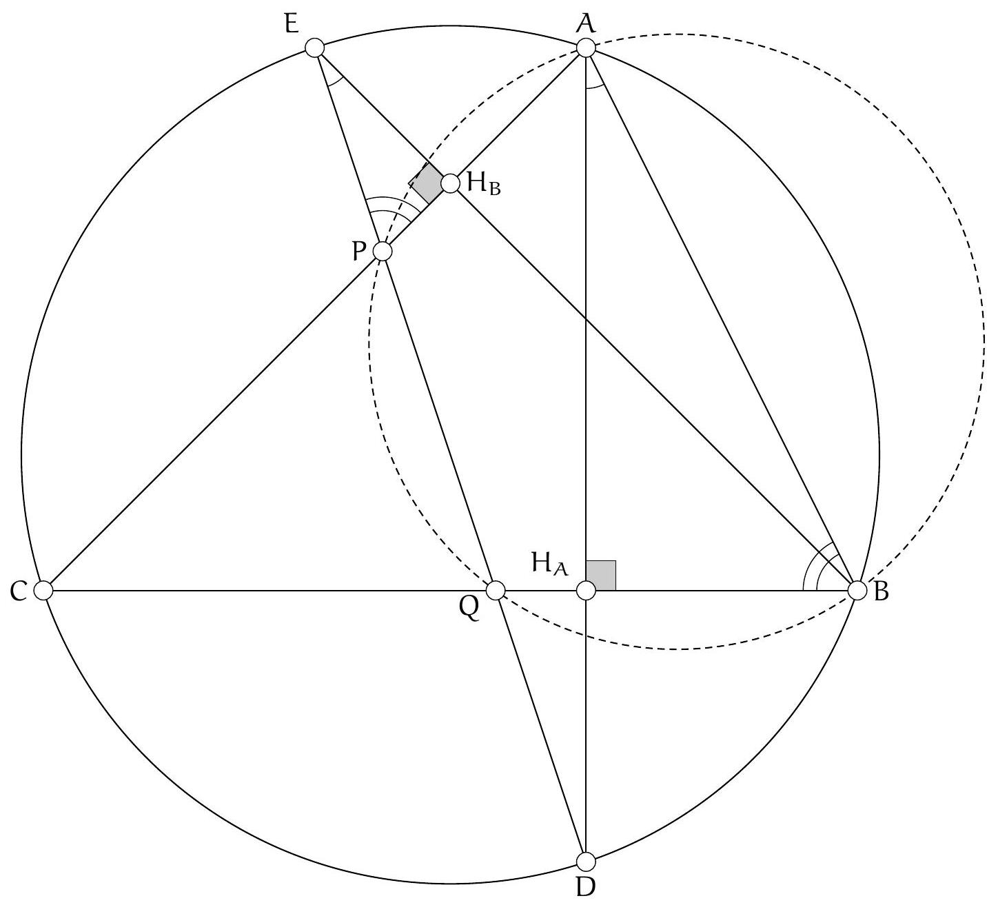 Ainsi, $\left(C_{A} A^{*}, A^{*} B_{A}\right)=2\left(C_{A} A, A B_{A}\right)$ et $A^{*}$ est le centre du cercle circonscrit de $A B_{A} C_{A}$. Mais dans ce cas $\left(A^{*} A, A C\right)=\left(A A^{*}, A C_{A}\right)=90-\left(C_{A} B_{A}, B_{A} A\right)=90-\left(B_{A}, B_{A} A\right)=90-$ $(O C, C A)=(A B, B C)$ (on utilise toujours le fait que la hauteur issue d'un sommet d'un triangle et la droite reliant ce somet avec le centre du cercle circonscrit sont conjugués isogonales)