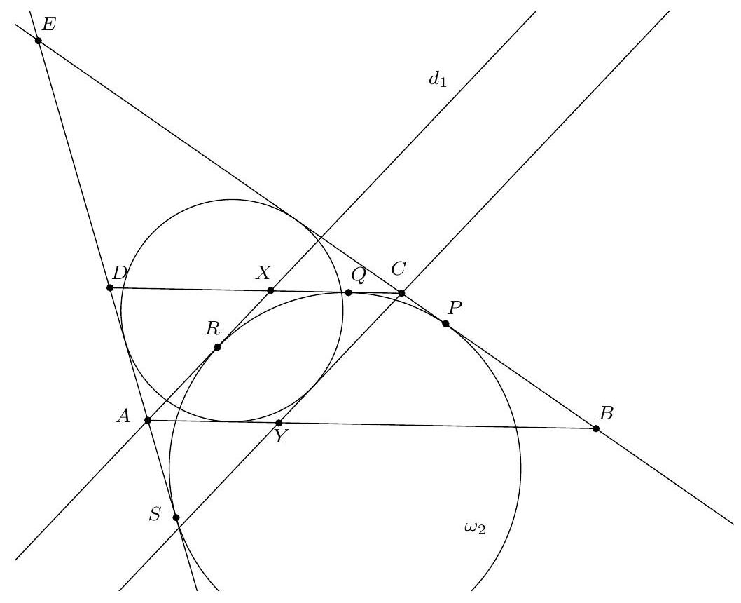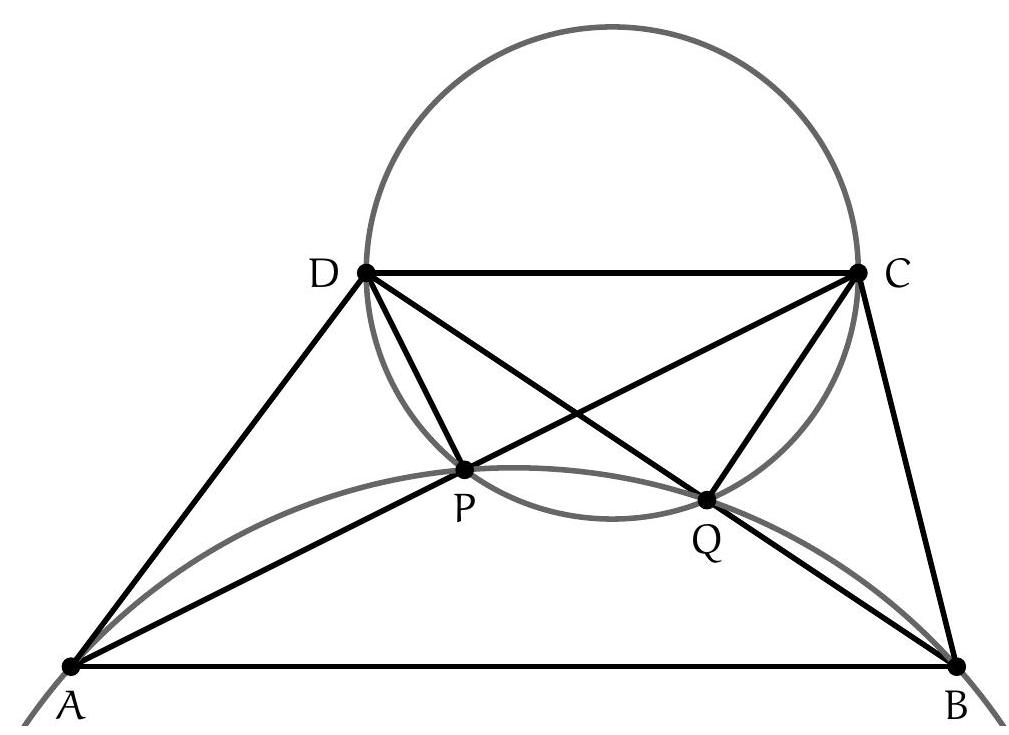 Soit $A B C D$ un trapèze tel que $(A B)$ soit parallèle à $(C D)$. Soit $P$ un point de $[A C]$ et $Q$ un point de $[B D]$ tels que $\widehat{A P D}=\widehat{\mathrm{BQC}}$.