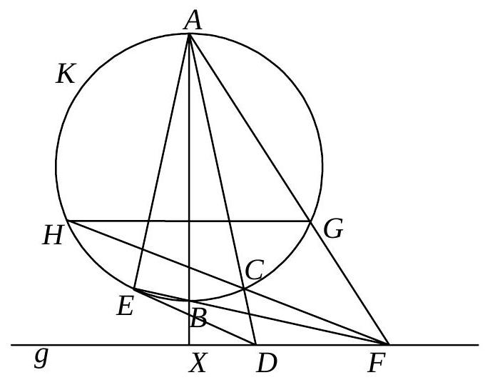Ferner sei $\overline{A B}$ der Durchmesser von K , der orthogonal zu g ist, wobei B näher an g liegt als $A$. Weiter sei ein beliebiger Punkt $C$, verschieden von $A$ und $B$, auf $K$ gegeben. Die Gerade AC schneidet g in D; die Gerade DE berührt K in E, wobei B und E auf derselben Seite von AC liegen. Schließlich schneidet BE die Gerade g im Punkt F und AF den Kreis K außer in A im Punkt G.