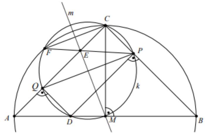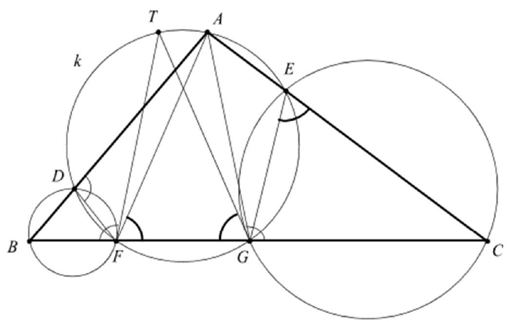 d.h. $|D F|^{2}=|D A| \cdot|D C|$ gilt. Nach dem TangentenSekantensatz gilt allerdings $|D E|^{2}=|D A| \cdot|D C|$, so dass nur $|D E|=|D F|$ zu zeigen bleibt, was mit $\angle D E F=\angle E F D$ gleichbedeutend ist.