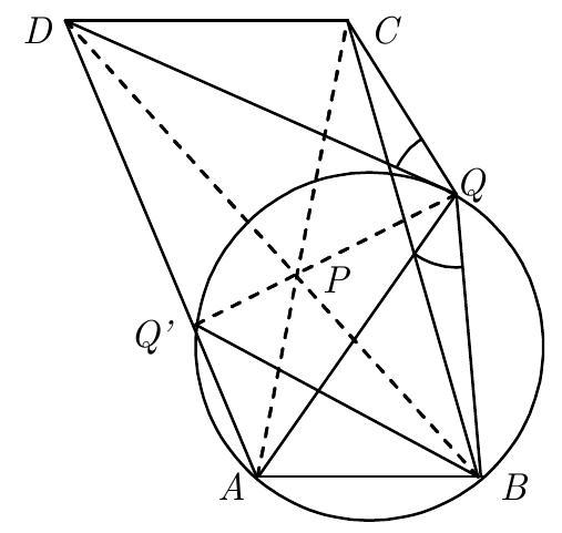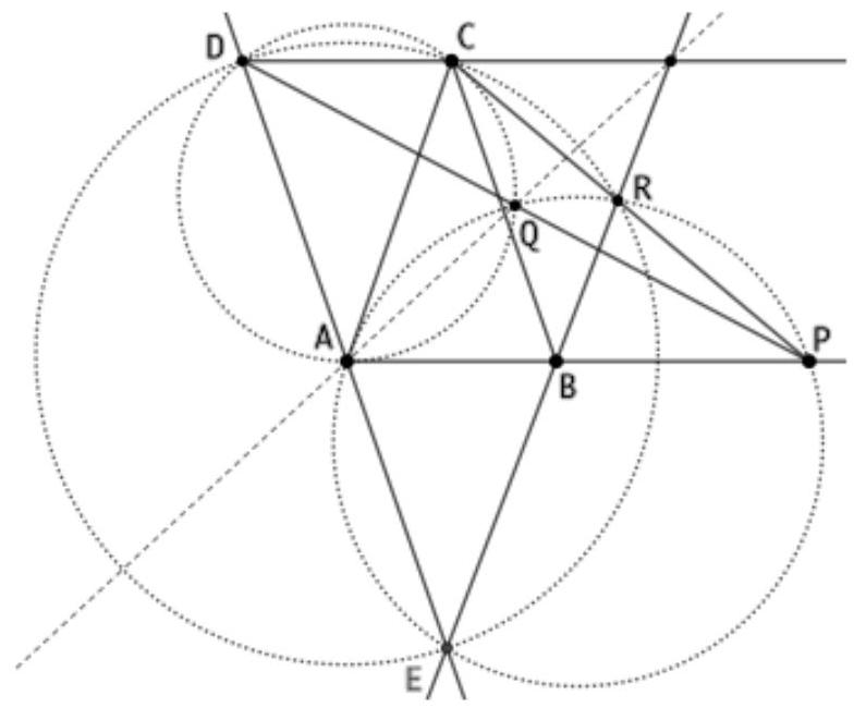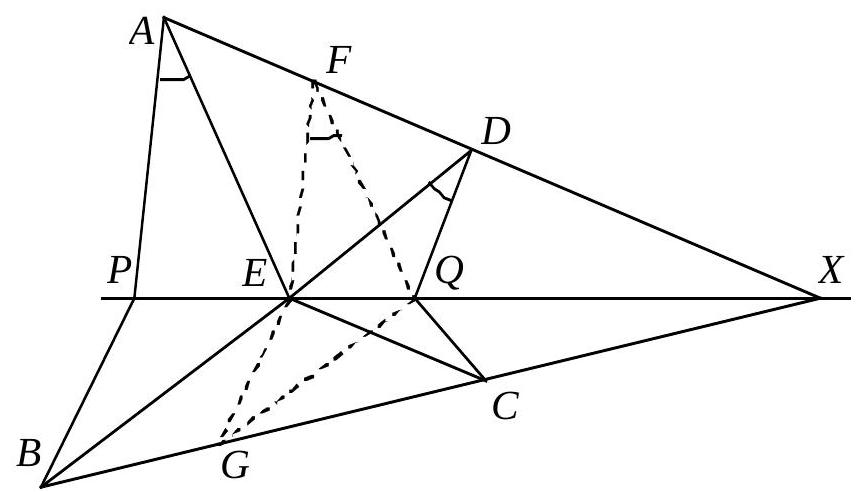 III. As before, we conclude from $BC \| DF$ that $BCDF$ is also an isosceles trapezoid. By repeated application of the inscribed angle theorem, we now get $\varangle DEC + \varangle CAB \equiv \varangle DAC + \varangle CAB \equiv \varangle DAB \equiv \varangle DFB \equiv \varangle CDF \equiv \varangle CEF \equiv \varangle CEX + \varangle XEF$. From $\varangle DEC \equiv \varangle CEX$, it follows that $\varangle CAB \equiv \varangle XEF$, or, in other words, $-\varangle PAB \equiv \varangle XEQ$.