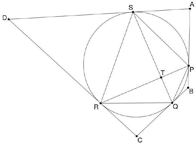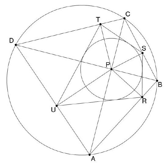 First we show that $R S T U$ is always inscriptible. Note that in addition to $A B C D$, we have cyclic quadrilaterals $A R P U$ and $B S P R$. Thus,