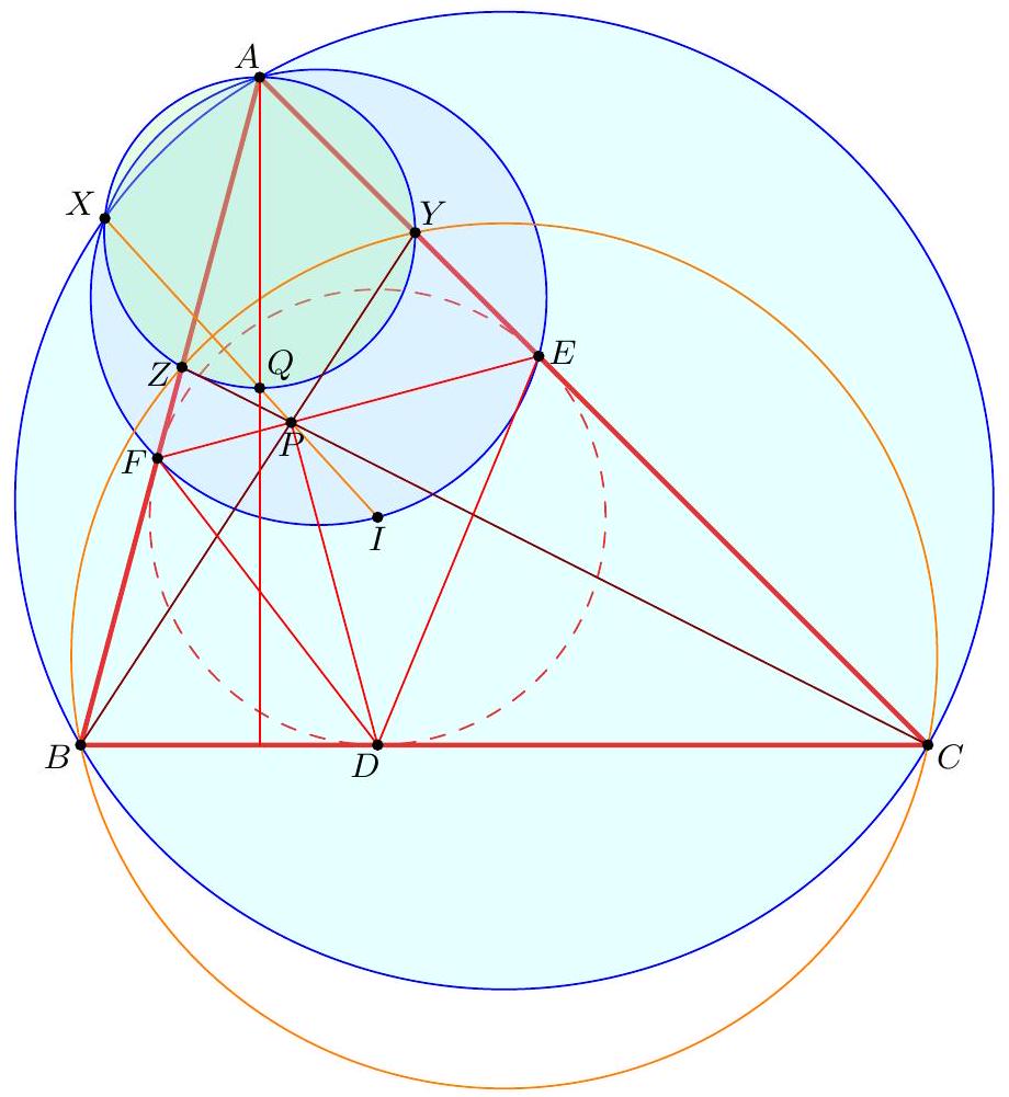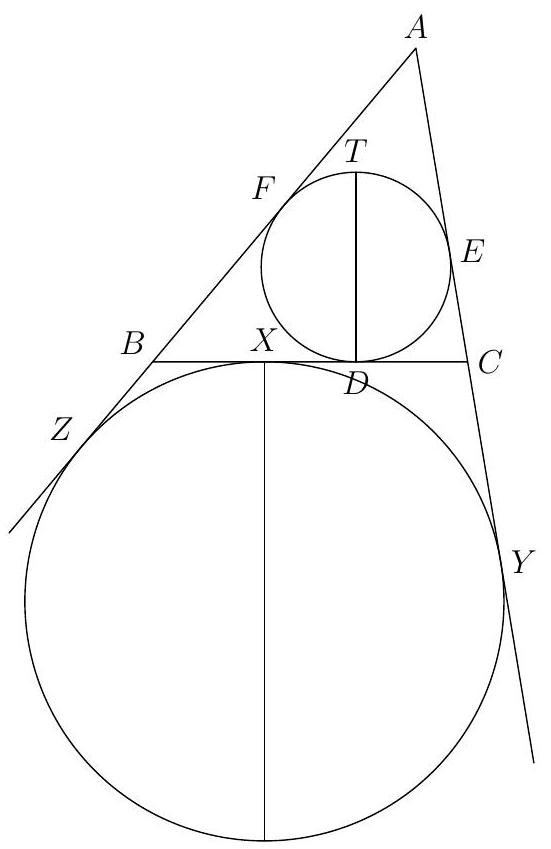 Since $X Y$ and $B C$ are parallel, there is a dilation centered at $A$ that sends $X Y$ to $B C$. So it must send the midpoint $Z$ to the midpoint $M$. Therefore, $A, Z, M$ are collinear. It follows that $D T, A M, E F$ are concurrent.