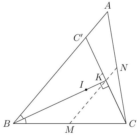 Since $I, K, E, C$ are concyclic, we have $\angle I K C=\angle I E C=90^{\circ}$. Let $C^{\prime}$ be the reflection of $C$ across $B I$, then $C^{\prime}$ must lie on $A B$. Then, $K$ is the midpoint of $C C^{\prime}$. Consider a dilation centered at $C$ with factor $\frac{1}{2}$. Since $C^{\prime}$ lies on $A B$, it follows that $K$ lies on $M N$.