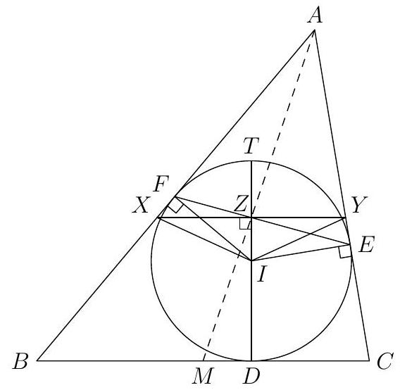 Let lines $D T$ and $E F$ meet at $Z$. Construct a line through $Z$ parallel to $B C$, and let it meet $A B$ and $A C$ at $X$ and $Y$, respectively. We have $\angle X Z I=90^{\circ}$, and $\angle X F I=90^{\circ}$. Therefore, $F, Z, I, X$ are concyclic, and thus $\angle I X Z=\angle I F Z$. By similar arguments, we also have $\angle I Y Z=\angle I E Z$. Thus, triangles $I F E$ and $I X Y$ are similar. Since $I E=I F$, we must also have $I X=I Y$. Since $I Z$ is an altitude of the isosceles triangle $I X Y, Z$ is the midpoint of $X Y$.