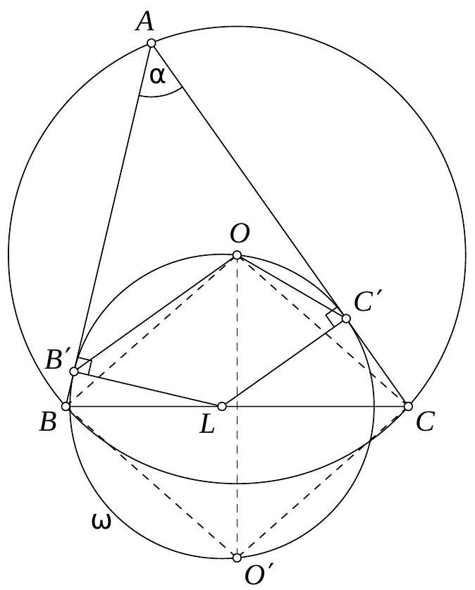 The point $B^{\prime}$, being the perpendicular foot of $L$, is an interior point of side $A B$. Analogously, $C^{\prime}$ lies in the interior of $A C$. The point $O$ is located inside the triangle $A B^{\prime} C^{\prime}$, hence $\angle C O B<\angle C^{\prime} O B^{\prime}$.  Let $\alpha=\angle C A B$. The angles $\angle C A B$ and $\angle C^{\prime} O B^{\prime}$ are inscribed into the two circles with centers $O$ and $L$, respectively, so $\angle C O B=2 \angle C A B=2 \alpha$ and $2 \angle C^{\prime} O B^{\prime}=360^{\circ}-\angle C^{\prime} L B^{\prime}$. From the kite $A B^{\prime} L C^{\prime}$ we have $\angle C^{\prime} L B^{\prime}=180^{\circ}-\angle C^{\prime} A B^{\prime}=180^{\circ}-\alpha$. Combining these, we get $$ 2 \alpha=\angle C O B<\angle C^{\prime} O B^{\prime}=\frac{360^{\circ}-\angle C^{\prime} L B^{\prime}}{2}=\frac{360^{\circ}-\left(180^{\circ}-\alpha\right)}{2}=90^{\circ}+\frac{\alpha}{2}, $$ So $$ \alpha<60^{\circ} \text {. } $$ Let $O^{\prime}$ be the reflection of $O$ in the line $B C$. In the quadrilateral $A B O^{\prime} C$ we have $$ \angle C O^{\prime} B+\angle C A B=\angle C O B+\angle C A B=2 \alpha+\alpha<180^{\circ}, $$ so the point $O^{\prime}$ is outside the circle $A B C$. Hence, $O$ and $O^{\prime}$ are two points of $\omega$ such that one of them lies inside the circumcircle, while the other one is located outside. Therefore, the two circles intersect. Comment. There are different ways of reducing the statement of the problem to the case $\alpha<60^{\circ}$. E.g., since the point $O$ lies in the interior of the isosceles triangle $A B^{\prime} C^{\prime}$, we have $O A<A B^{\prime}$. So, if $A B^{\prime} \leq 2 L B^{\prime}$ then $O A<2 L O$, which means that $\omega$ intersects the circumcircle of $A B C$. Hence the only interesting case is $A B^{\prime}>2 L B^{\prime}$, and this condition implies $\angle C A B=2 \angle B^{\prime} A L<2 \cdot 30^{\circ}=60^{\circ}$.