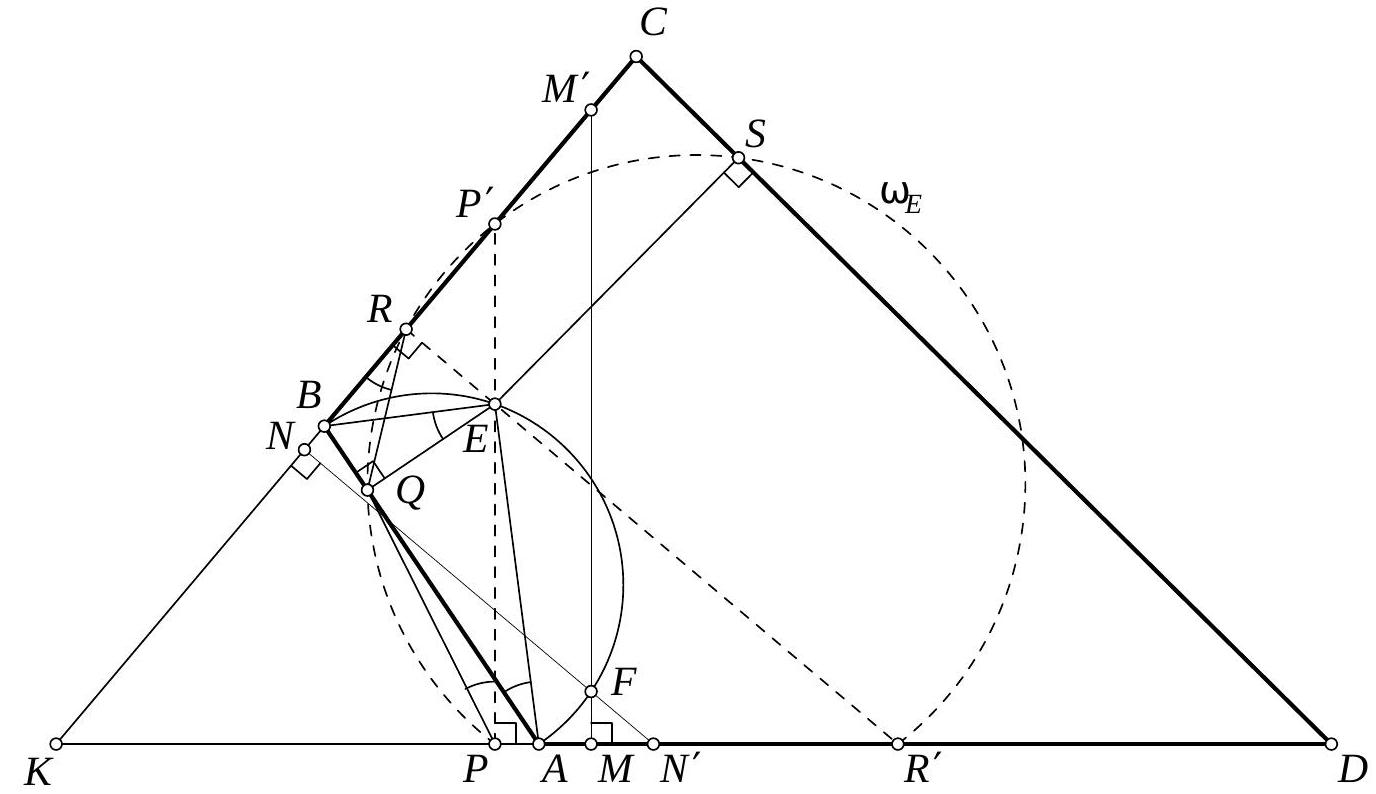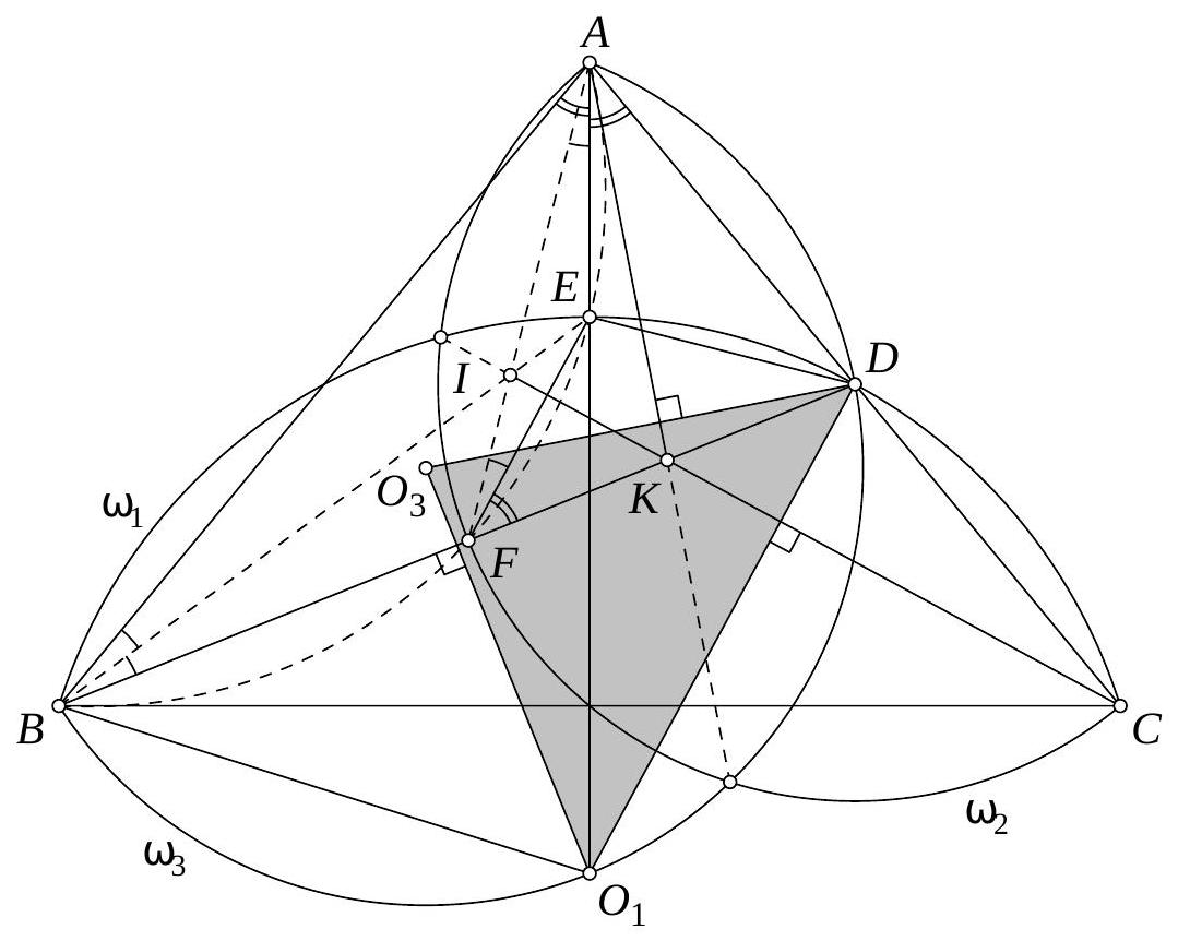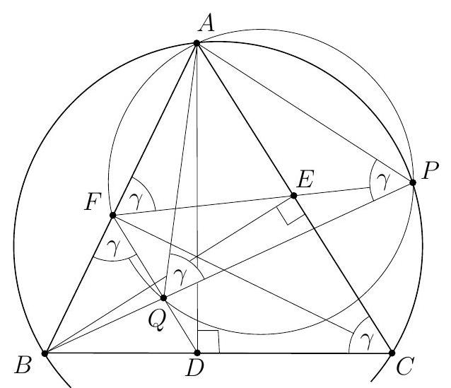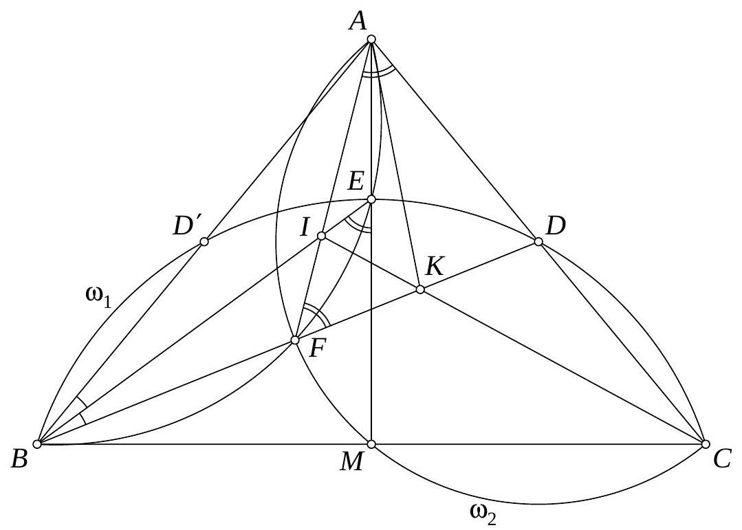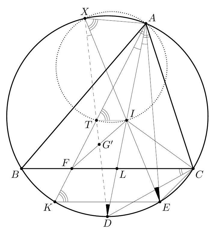 Again, let $M$ be the midpoint of $B C$. As in the previous solutions, we can deduce $\angle A B I=\angle I B K$. We show that the point $I$ lies on the angle bisector of $\angle K A B$. Let $G$ be the intersection point of the circles $A F C$ and $B C D$, different from $C$. The lines $C G, A F$, and $B E$ are the radical axes of the three circles $A G F C, C D B$, and $A B F E$, so $I=A F \cap B E$ is the radical center of the three circles and $C G$ also passes through $I$.  The angle between line $D E$ and the tangent to the circle $B C D$ at $E$ is equal to $\angle E B D=$ $\angle E A F=\angle A B E=\angle A F E$. As the tangent at $E$ is perpendicular to $A M$, the line $D E$ is perpendicular to $A F$. The triangle $A F E$ is isosceles, so $D E$ is the perpendicular bisector of $A F$ and thus $A D=D F$. Hence, the point $D$ is the center of the circle $A F C$, and this circle passes through $M$ as well since $\angle A M C=90^{\circ}$. Let $B^{\prime}$ be the reflection of $B$ in the point $D$, so $A B C B^{\prime}$ is a parallelogram. Since $D C=D G$ we have $\angle G C D=\angle D B C=\angle K B^{\prime} A$. Hence, the quadrilateral $A K C B^{\prime}$ is cyclic and thus $\angle C A K=\angle C B^{\prime} K=\angle A B D=2 \angle M A I$. Then $$ \angle I A B=\angle M A B-\angle M A I=\frac{1}{2} \angle C A B-\frac{1}{2} \angle C A K=\frac{1}{2} \angle K A B $$ and therefore $A I$ is the angle bisector of $\angle K A B$.