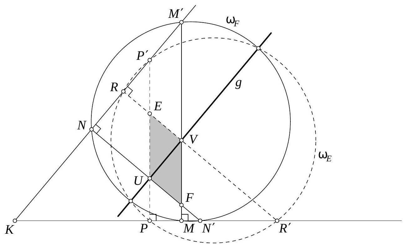 As in $$ \left(\frac{\boldsymbol{e}-\boldsymbol{f}}{2}\right)^{2}=\left(\frac{\boldsymbol{e}+\boldsymbol{f}}{2}-\frac{\boldsymbol{a}+\boldsymbol{b}}{2}\right)\left(\frac{\boldsymbol{e}+\boldsymbol{f}}{2}-\frac{\boldsymbol{c}+\boldsymbol{d}}{2}\right) $$ or equivalently $$ 4 \boldsymbol{e f}-(\boldsymbol{e}+\boldsymbol{f})(\boldsymbol{a}+\boldsymbol{b}+\boldsymbol{c}+\boldsymbol{d})+(\boldsymbol{a}+\boldsymbol{b})(\boldsymbol{c}+\boldsymbol{d})=0 $$ With $R$ as the circumradius of $A B C D$, we obtain for the powers $\mathcal{P}(E)$ and $\mathcal{P}(F)$ of $E$ and $F$, respectively, with respect to the circumcircle $$ \begin{aligned} & \mathcal{P}(E)=(\boldsymbol{e}-\boldsymbol{a})(\boldsymbol{e}-\boldsymbol{c})=(\boldsymbol{e}-\boldsymbol{b})(\boldsymbol{e}-\boldsymbol{d})=\boldsymbol{e}^{2}-R^{2} \\ & \mathcal{P}(F)=(\boldsymbol{f}-\boldsymbol{a})(\boldsymbol{f}-\boldsymbol{d})=(\boldsymbol{f}-\boldsymbol{b})(\boldsymbol{f}-\boldsymbol{c})=\boldsymbol{f}^{2}-R^{2} \end{aligned} $$ hence $$ \begin{aligned} & (\boldsymbol{e}-\boldsymbol{a})(\boldsymbol{e}-\boldsymbol{c})=\boldsymbol{e}^{2}-R^{2} \\ & (\boldsymbol{e}-\boldsymbol{b})(\boldsymbol{e}-\boldsymbol{d})=\boldsymbol{e}^{2}-R^{2} \\ & (\boldsymbol{f}-\boldsymbol{a})(\boldsymbol{f}-\boldsymbol{d})=\boldsymbol{f}^{2}-R^{2} \\ & (\boldsymbol{f}-\boldsymbol{b})(\boldsymbol{f}-\boldsymbol{c})=\boldsymbol{f}^{2}-R^{2} \end{aligned} $$ Since $F$ lies on the polar to $E$ with respect to the circumcircle, we have $$ 4 \boldsymbol{e} \boldsymbol{f}=4 R^{2} $$ Adding up (3) to (7) yields (2), as desired.