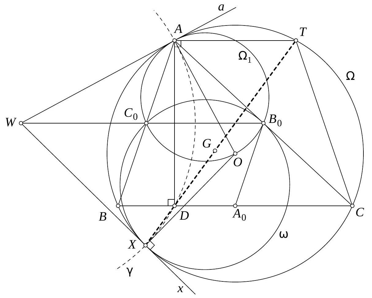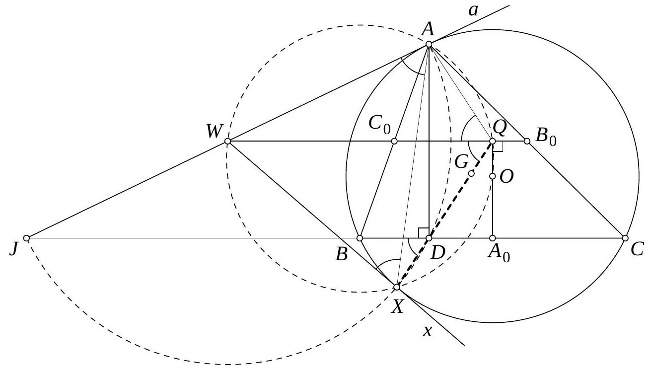 We define the points $A_{0}, O$, and $W$ as in the previous solution and we concentrate on the case $A B<A C$. Let $Q$ be the perpendicular projection of $A_{0}$ on $B_{0} C_{0}$. Since $\angle W A O=\angle W Q O=\angle O X W=90^{\circ}$, the five points $A, W, X, O$, and $Q$ lie on a common circle. Furthermore, the reflections with respect to $B_{0} C_{0}$ and $O W$ map $A$ to $D$ and $X$, respectively. For these reasons, we have $$ \angle W Q D=\angle A Q W=\angle A X W=\angle W A X=\angle W Q X . $$ Thus the three points $Q, D$, and $X$ lie on a common line, say $\ell$.  To complete the argument, we note that the homothety centered at $G$ sending the triangle $A B C$ to the triangle $A_{0} B_{0} C_{0}$ maps the altitude $A D$ to the altitude $A_{0} Q$. Therefore it maps $D$ to $Q$, so the points $D, G$, and $Q$ are collinear. Hence $G$ lies on $\ell$ as well. Comment. There are various other ways to prove the collinearity of $Q, D$, and $X$ obtained in the middle part of Solution 2. Introduce for instance the point $J$ where the lines $A W$ and $B C$ intersect. Then the four points $A, D, X$, and $J$ lie at the same distance from $W$, so the quadrilateral $A D X J$ is cyclic. In combination with the fact that $A W X Q$ is cyclic as well, this implies $$ \angle J D X=\angle J A X=\angle W A X=\angle W Q X $$ Since $B C \| W Q$, it follows that $Q, D$, and $X$ are indeed collinear.