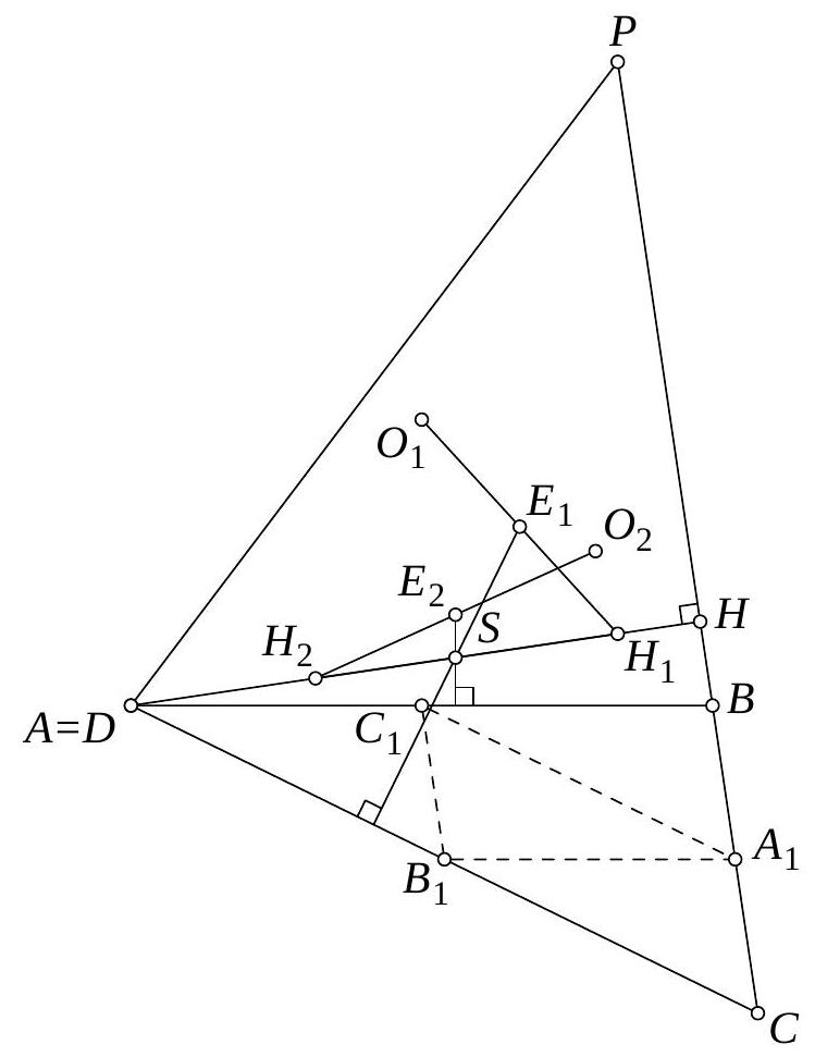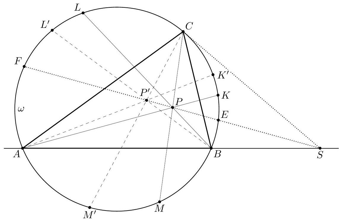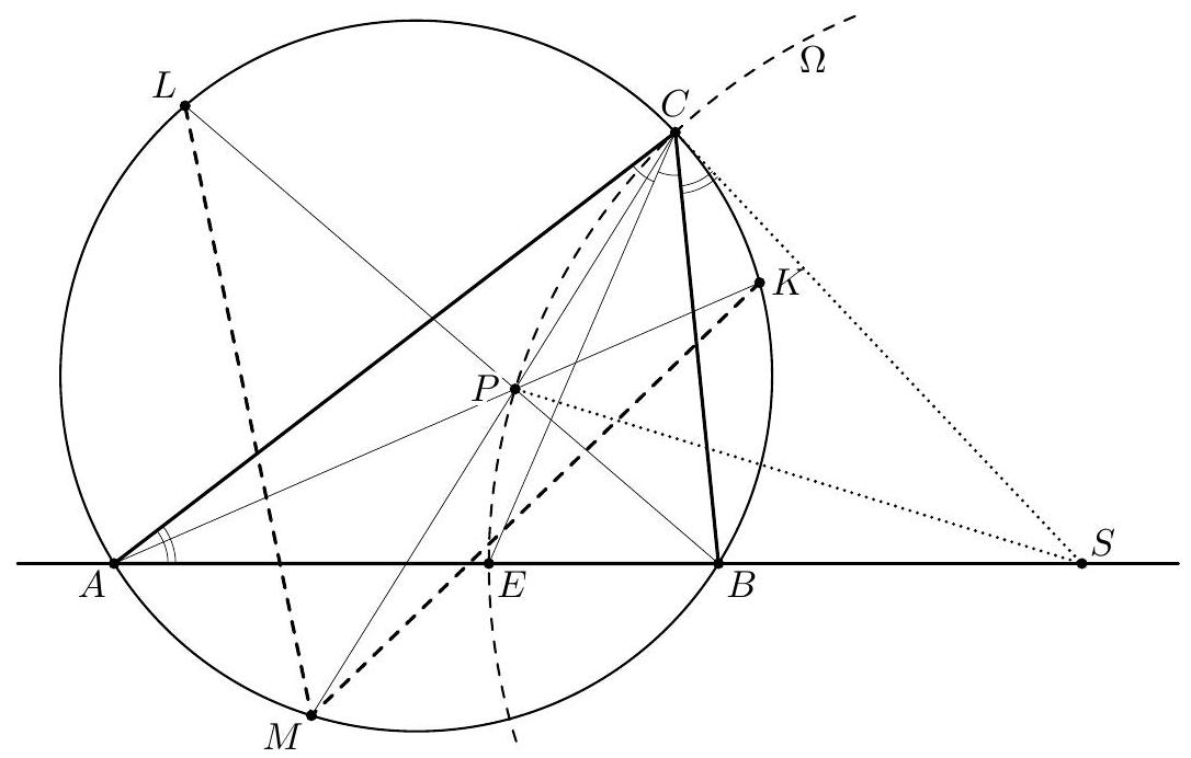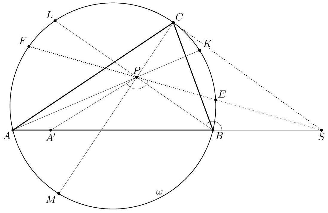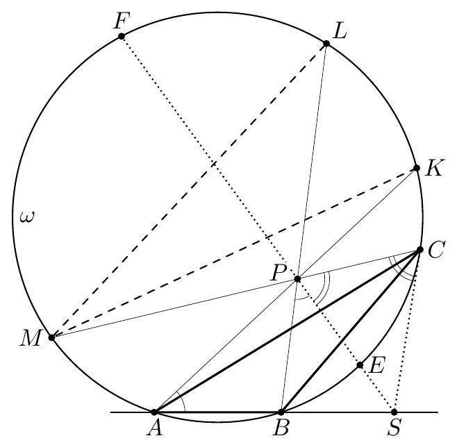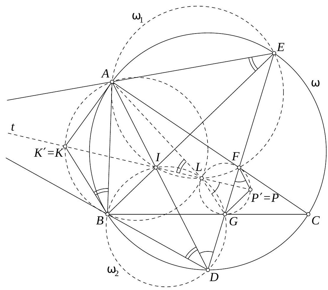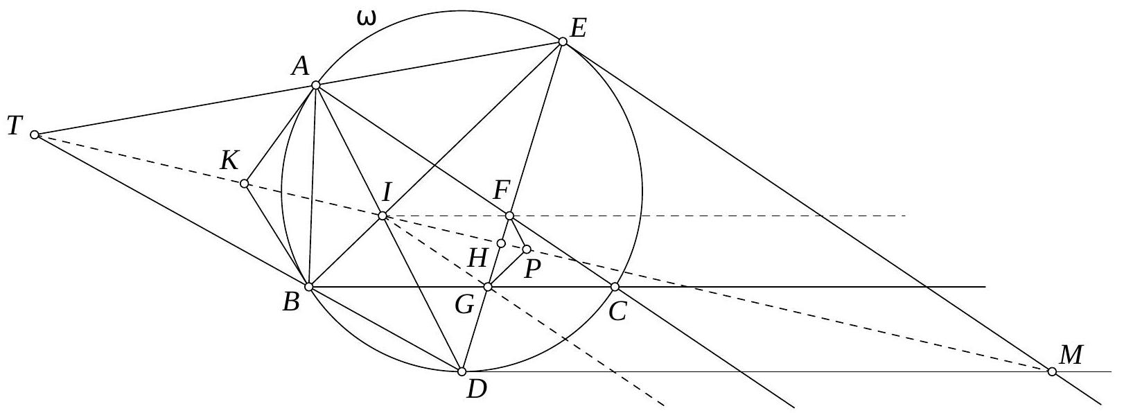 Let $M$ be the intersection point of the tangents to $\omega$ at $D$ and $E$, and let the lines $A E$ and $B D$ meet at $T$; if $A E$ and $B D$ are parallel, then let $T$ be their common ideal point. It is well-known that the points $K$ and $M$ lie on the line $T I$ (as a consequence of PASCAL's theorem, applied to the inscribed degenerate hexagons $A A D B B E$ and $A D D B E E)$. The lines $A D$ and $B E$ are the angle bisectors of the angles $\angle C A B$ and $\angle A B C$, respectively, so $D$ and $E$ are the midpoints of the $\operatorname{arcs} B C$ and $C A$ of the circle $\omega$, respectively. Hence, $D M$ is parallel to $B C$ and $E M$ is parallel to $A C$. Apply PASCAL's theorem to the degenerate hexagon $C A D D E B$. By the theorem, the points $C A \cap D E=F, A D \cap E B=I$ and the common ideal point of lines $D M$ and $B C$ are collinear, therefore $F I$ is parallel to $B C$ and $D M$. Analogously, the line $G I$ is parallel to $A C$ and $E M$.  Now consider the homothety with scale factor $-\frac{F G}{E D}$ which takes $E$ to $G$ and $D$ to $F$. Since the triangles $E D M$ and $G F I$ have parallel sides, the homothety takes $M$ to $I$. Similarly, since the triangles $D E I$ and $F G P$ have parallel sides, the homothety takes $I$ to $P$. Hence, the points M, I, $P$ and the homothety center $H$ must lie on the same line. Therefore, the point $P$ also lies on the line $T K I M$. Comment. One may prove that $I F \| B C$ and $I G \| A C$ in a more elementary way. Since $\angle A D E=$ $\angle E D C$ and $\angle D E B=\angle C E D$, the points $I$ and $C$ are symmetric about $D E$. Moreover, since the $\operatorname{arcs} A E$ and $E C$ are equal and the arcs $C D$ and $D B$ are equal, we have $\angle C F G=\angle F G C$, so the triangle $C F G$ is isosceles. Hence, the quadrilateral $I F C G$ is a rhombus.