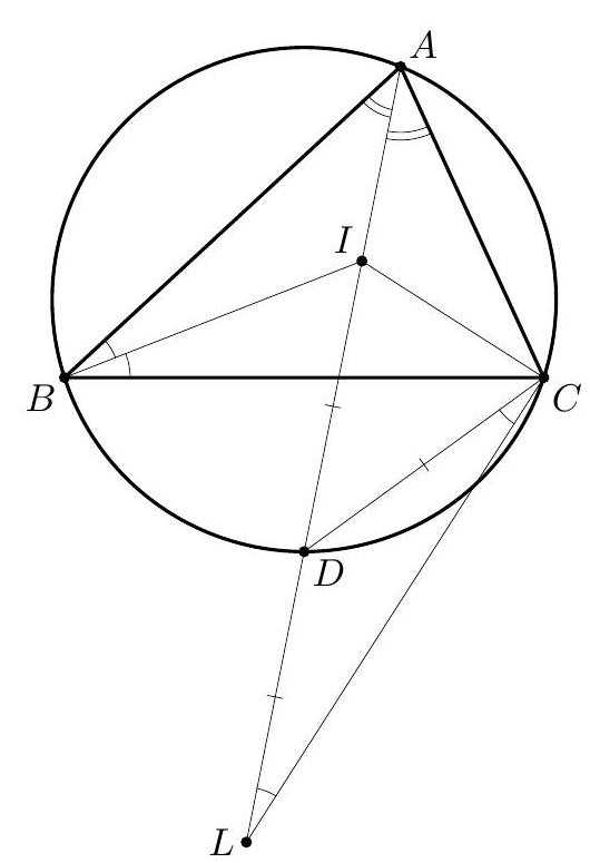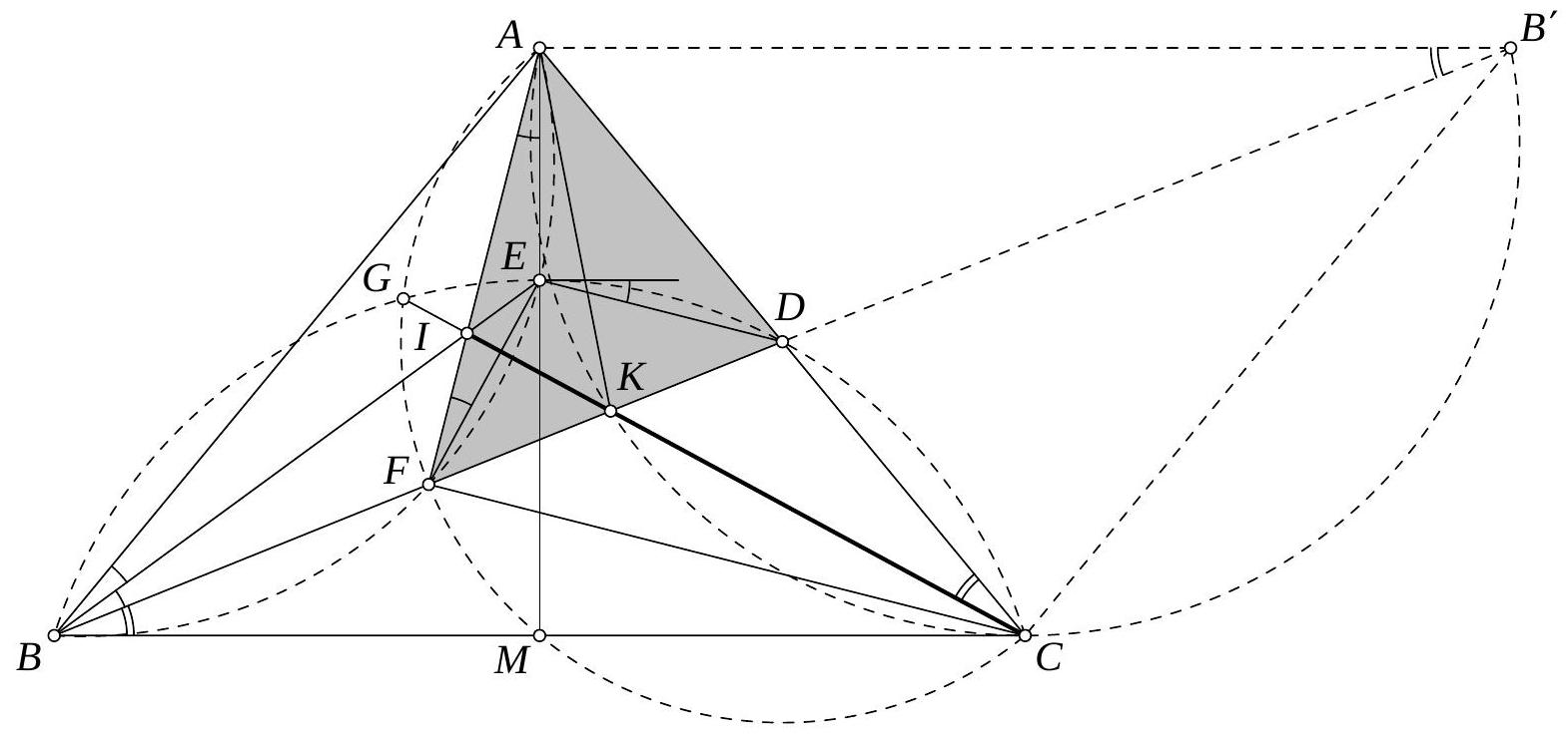 Let $D^{\prime}$ be the midpoint of the segment $A B$, and let $M$ be the midpoint of $B C$. By symmetry at line $A M$, the point $D^{\prime}$ has to lie on the circle $B C D$. Since the $\operatorname{arcs} D^{\prime} E$ and $E D$ of that circle are equal, we have $\angle A B I=\angle D^{\prime} B E=\angle E B D=I B K$, so $I$ lies on the angle bisector of $\angle A B K$. For this reason it suffices to prove in the sequel that the ray $A I$ bisects the angle $\angle B A K$. From $$ \angle D F A=180^{\circ}-\angle B F A=180^{\circ}-\angle B E A=\angle M E B=\frac{1}{2} \angle C E B=\frac{1}{2} \angle C D B $$ we derive $\angle D F A=\angle D A F$ so the triangle $A F D$ is isosceles with $A D=D F$.  Applying MenELaUs's theorem to the triangle $A D F$ with respect to the line $C I K$, and applying the angle bisector theorem to the triangle $A B F$, we infer $$ 1=\frac{A C}{C D} \cdot \frac{D K}{K F} \cdot \frac{F I}{I A}=2 \cdot \frac{D K}{K F} \cdot \frac{B F}{A B}=2 \cdot \frac{D K}{K F} \cdot \frac{B F}{2 \cdot A D}=\frac{D K}{K F} \cdot \frac{B F}{A D} $$ and therefore $$ \frac{B D}{A D}=\frac{B F+F D}{A D}=\frac{B F}{A D}+1=\frac{K F}{D K}+1=\frac{D F}{D K}=\frac{A D}{D K} $$ It follows that the triangles $A D K$ and $B D A$ are similar, hence $\angle D A K=\angle A B D$. Then $$ \angle I A B=\angle A F D-\angle A B D=\angle D A F-\angle D A K=\angle K A I $$ shows that the point $K$ is indeed lying on the angle bisector of $\angle B A K$.