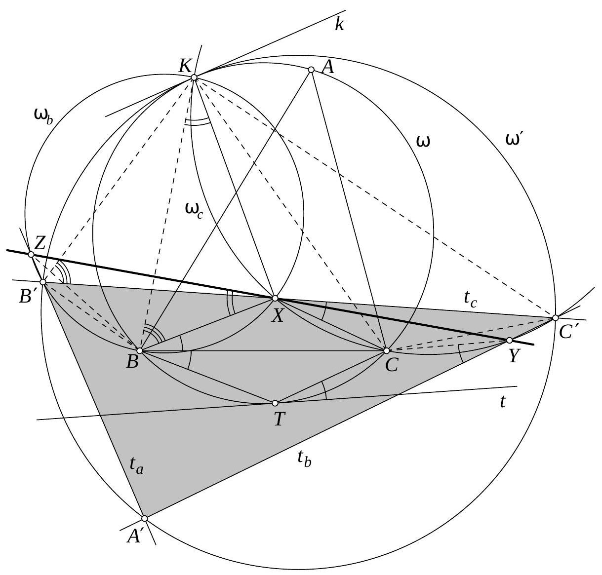 Define the points $T, A^{\prime}, B^{\prime}$, and $C^{\prime}$ in the same way as in the previous solution. Let $X, Y$, and $Z$ be the symmetric images of $T$ about the lines $B C, C A$, and $A B$, respectively. Note that the projections of $T$ on these lines form a Simson line of $T$ with respect to $A B C$, therefore the points $X, Y, Z$ are also collinear. Moreover, we have $X \in B^{\prime} C^{\prime}, Y \in C^{\prime} A^{\prime}$, $Z \in A^{\prime} B^{\prime}$. Denote $\alpha=\angle(t, T C)=\angle(B T, B C)$. Using the symmetry in the lines $A C$ and $B C$, we get $$ \angle(B C, B X)=\angle(B T, B C)=\alpha \quad \text { and } \quad \angle\left(X C, X C^{\prime}\right)=\angle(t, T C)=\angle\left(Y C, Y C^{\prime}\right)=\alpha . $$ Since $\angle\left(X C, X C^{\prime}\right)=\angle\left(Y C, Y C^{\prime}\right)$, the points $X, Y, C, C^{\prime}$ lie on some circle $\omega_{c}$. Define the circles $\omega_{a}$ and $\omega_{b}$ analogously. Let $\omega^{\prime}$ be the circumcircle of triangle $A^{\prime} B^{\prime} C^{\prime}$. Now, applying Miquel's theorem to the four lines $A^{\prime} B^{\prime}, A^{\prime} C^{\prime}, B^{\prime} C^{\prime}$, and $X Y$, we obtain that the circles $\omega^{\prime}, \omega_{a}, \omega_{b}, \omega_{c}$ intersect at some point $K$. We will show that $K$ lies on $\omega$, and that the tangent lines to $\omega$ and $\omega^{\prime}$ at this point coincide; this implies the problem statement. Due to symmetry, we have $X B=T B=Z B$, so the point $B$ is the midpoint of one of the $\operatorname{arcs} X Z$ of circle $\omega_{b}$. Therefore $\angle(K B, K X)=\angle(X Z, X B)$. Analogously, $\angle(K X, K C)=$ $\angle(X C, X Y)$. Adding these equalities and using the symmetry in the line $B C$ we get $$ \angle(K B, K C)=\angle(X Z, X B)+\angle(X C, X Z)=\angle(X C, X B)=\angle(T B, T C) . $$ Therefore, $K$ lies on $\omega$. Next, let $k$ be the tangent line to $\omega$ at $K$. We have $$ \begin{aligned} \angle\left(k, K C^{\prime}\right) & =\angle(k, K C)+\angle\left(K C, K C^{\prime}\right)=\angle(K B, B C)+\angle\left(X C, X C^{\prime}\right) \\ & =(\angle(K B, B X)-\angle(B C, B X))+\alpha=\angle\left(K B^{\prime}, B^{\prime} X\right)-\alpha+\alpha=\angle\left(K B^{\prime}, B^{\prime} C^{\prime}\right), \end{aligned} $$ which means exactly that $k$ is tangent to $\omega^{\prime}$.  Comment. There exist various solutions combining the ideas from the two solutions presented above. For instance, one may define the point $X$ as the reflection of $T$ with respect to the line $B C$, and then introduce the point $K$ as the second intersection point of the circumcircles of $B B^{\prime} X$ and $C C^{\prime} X$. Using the fact that $B B^{\prime}$ and $C C^{\prime}$ are the bisectors of $\angle\left(A^{\prime} B^{\prime}, B^{\prime} C^{\prime}\right)$ and $\angle\left(A^{\prime} C^{\prime}, B^{\prime} C^{\prime}\right)$ one can show successively that $K \in \omega, K \in \omega^{\prime}$, and that the tangents to $\omega$ and $\omega^{\prime}$ at $K$ coincide.