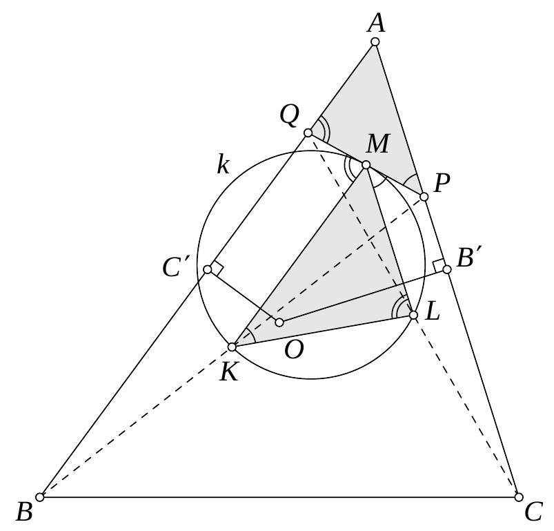Let $K, L, M, B^{\prime}, C^{\prime}$ be the midpoints of $B P, C Q, P Q, C A$, and $A B$, respectively (see Figure 1). Since $C A \| L M$, we have $\angle L M P=\angle Q P A$. Since $k$ touches the segment $P Q$ at $M$, we find $\angle L M P=\angle L K M$. Thus $\angle Q P A=\angle L K M$. Similarly it follows from $A B \| M K$ that $\angle P Q A=\angle K L M$. Therefore, triangles $A P Q$ and $M K L$ are similar, hence $$ \frac{A P}{A Q}=\frac{M K}{M L}=\frac{\frac{Q B}{2}}{\frac{P C}{2}}=\frac{Q B}{P C} $$ Now (1) is equivalent to $A P \cdot P C=A Q \cdot Q B$ which means that the power of points $P$ and $Q$ with respect to the circumcircle of $\triangle A B C$ are equal, hence $O P=O Q$.  Figure 1 Comment. The last argument can also be established by the following calculation: $$ \begin{aligned} O P^{2}-O Q^{2} & =O B^{\prime 2}+B^{\prime} P^{2}-O C^{2}-C^{\prime} Q^{2} \\ & =\left(O A^{2}-A B^{2}\right)+B^{\prime} P^{2}-\left(O A^{2}-A C^{\prime 2}\right)-C^{\prime} Q^{2} \\ & =\left(A C^{\prime 2}-C^{\prime} Q^{2}\right)-\left(A B^{\prime 2}-B^{\prime} P^{2}\right) \\ & =\left(A C^{\prime}-C^{\prime} Q\right)\left(A C^{\prime}+C^{\prime} Q\right)-\left(A B^{\prime}-B^{\prime} P\right)\left(A B^{\prime}+B^{\prime} P\right) \\ & =A Q \cdot Q B-A P \cdot P C . \end{aligned} $$ With (1), we conclude $O P^{2}-O Q^{2}=0$, as desired.