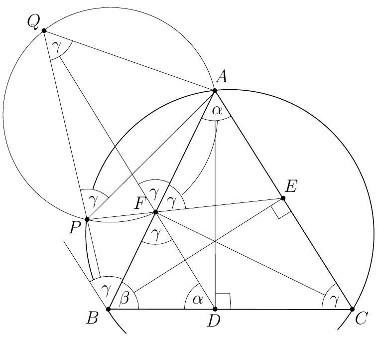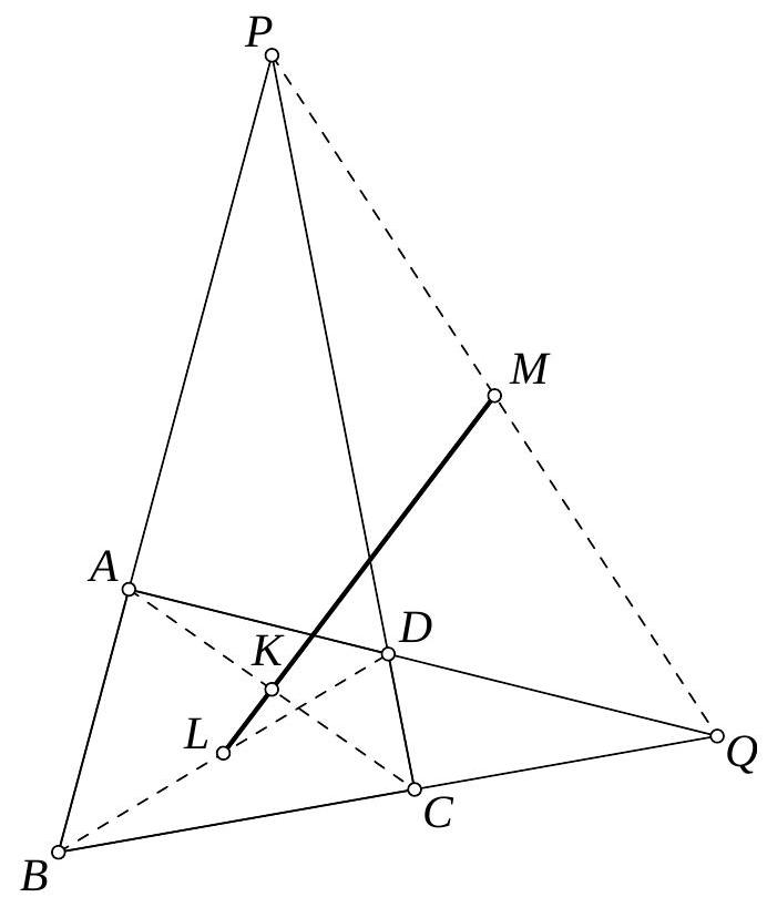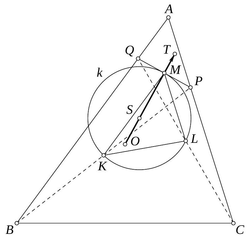 Again, denote by $K, L, M$ the midpoints of segments $B P, C Q$, and $P Q$, respectively. Let $O, S, T$ be the circumcenters of triangles $A B C, K L M$, and $A P Q$, respectively (see Figure 2). Note that $M K$ and $L M$ are the midlines in triangles $B P Q$ and $C P Q$, respectively, so $\overrightarrow{M K}=\frac{1}{2} \overrightarrow{Q B}$ and $\overrightarrow{M L}=\frac{1}{2} \overrightarrow{P C}$. Denote by $\operatorname{pr}_{l}(\vec{v})$ the projection of vector $\vec{v}$ onto line $l$. Then $\operatorname{pr}_{A B}(\overrightarrow{O T})=\operatorname{pr}_{A B}(\overrightarrow{O A}-\overrightarrow{T A})=\frac{1}{2} \overrightarrow{B A}-\frac{1}{2} \overrightarrow{Q A}=\frac{1}{2} \overrightarrow{B Q}=\overrightarrow{K M}$ and $\operatorname{pr}_{A B}(\overrightarrow{S M})=\operatorname{pr}_{M K}(\overrightarrow{S M})=$ $\frac{1}{2} \overrightarrow{K M}=\frac{1}{2} \operatorname{pr}_{A B}(\overrightarrow{O T})$. Analogously we get $\operatorname{pr}_{C A}(\overrightarrow{S M})=\frac{1}{2} \operatorname{pr}_{C A}(\overrightarrow{O T})$. Since $A B$ and $C A$ are not parallel, this implies that $\overrightarrow{S M}=\frac{1}{2} \overrightarrow{O T}$.  Figure 2 Now, since the circle $k$ touches $P Q$ at $M$, we get $S M \perp P Q$, hence $O T \perp P Q$. Since $T$ is equidistant from $P$ and $Q$, the line $O T$ is a perpendicular bisector of segment $P Q$, and hence $O$ is equidistant from $P$ and $Q$ which finishes the proof.