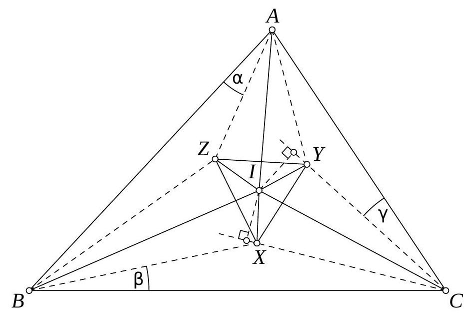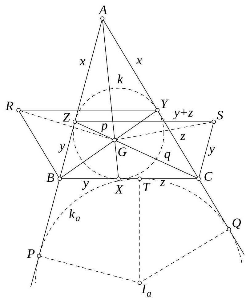 Denote $x=A Z=A Y, y=B Z=B X, z=C X=C Y, p=Z G, q=G C$. Several lengthy calculations (Menelaos' theorem in triangle $A Z C$, law of Cosines in triangles $A B C$ and $A Z C$ and Stewart's theorem in triangle $Z C S$ ) give four equations for $p, q, \cos \alpha$ and $G S$ in terms of $x, y$, and $z$ that can be resolved for $G S$. The result is symmetric in $y$ and $z$, so $G R=G S$. More in detail this means: The line $B Y$ intersects the sides of triangle $A Z C$, so Menelaos' theorem yields $\frac{p}{q} \cdot \frac{z}{x} \cdot \frac{x+y}{y}=1$, hence $$ \frac{p}{q}=\frac{x y}{y z+z x} . $$ Since we only want to show that the term for $G S$ is symmetric in $y$ and $z$, we abbreviate terms that are symmetric in $y$ and $z$ by capital letters, starting with $N=x y+y z+z x$. So (1) implies $$ \frac{p}{p+q}=\frac{x y}{x y+y z+z x}=\frac{x y}{N} \quad \text { and } \quad \frac{q}{p+q}=\frac{y z+z x}{x y+y z+z x}=\frac{y z+z x}{N} . $$ Now the law of Cosines in triangle $A B C$ yields $$ \cos \alpha=\frac{(x+y)^{2}+(x+z)^{2}-(y+z)^{2}}{2(x+y)(x+z)}=\frac{2 x^{2}+2 x y+2 x z-2 y z}{2(x+y)(x+z)}=1-\frac{2 y z}{(x+y)(x+z)} . $$ We use this result to apply the law of Cosines in triangle $A Z C$ : $$ \begin{aligned} (p+q)^{2} & =x^{2}+(x+z)^{2}-2 x(x+z) \cos \alpha \\ & =x^{2}+(x+z)^{2}-2 x(x+z) \cdot\left(1-\frac{2 y z}{(x+y)(x+z)}\right) \\ & =z^{2}+\frac{4 x y z}{x+y} . \end{aligned} $$ Now in triangle $Z C S$ the segment $G S$ is a cevian, so with StEWART's theorem we have $p y^{2}+q(y+z)^{2}=(p+q)\left(G S^{2}+p q\right)$, hence $$ G S^{2}=\frac{p}{p+q} \cdot y^{2}+\frac{q}{p+q} \cdot(y+z)^{2}-\frac{p}{p+q} \cdot \frac{q}{p+q} \cdot(p+q)^{2} . $$ Replacing the $p$ 's and $q$ 's herein by (2) and (3) yields $$ \begin{aligned} G S^{2} & =\frac{x y}{N} y^{2}+\frac{y z+z x}{N}(y+z)^{2}-\frac{x y}{N} \cdot \frac{y z+z x}{N} \cdot\left(z^{2}+\frac{4 x y z}{x+y}\right) \\ & =\frac{x y^{3}}{N}+\underbrace{\frac{y z(y+z)^{2}}{N}}_{M_{1}}+\frac{z x(y+z)^{2}}{N}-\frac{x y z^{3}(x+y)}{N^{2}}-\underbrace{\frac{4 x^{2} y^{2} z^{2}}{N^{2}}}_{M_{2}} \\ & =\frac{x y^{3}+z x(y+z)^{2}}{N}-\frac{x y z^{3}(x+y)}{N^{2}}+M_{1}-M_{2} \\ & =\underbrace{\frac{x\left(y^{3}+y^{2} z+y z^{2}+z^{3}\right)}{N}}_{M_{3}}+\frac{x y z^{2} N}{N^{2}}-\frac{x y z^{3}(x+y)}{N^{2}}+M_{1}-M_{2} \\ & =\frac{x^{2} y^{2} z^{2}+x y^{2} z^{3}+x^{2} y z^{3}-x^{2} y z^{3}-x y^{2} z^{3}}{N^{2}}+M_{1}-M_{2}+M_{3} \\ & =\frac{x^{2} y^{2} z^{2}}{N^{2}}+M_{1}-M_{2}+M_{3}, \end{aligned} $$ a term that is symmetric in $y$ and $z$, indeed. Comment. $G$ is known as GERGONnE's point of $\triangle A B C$.