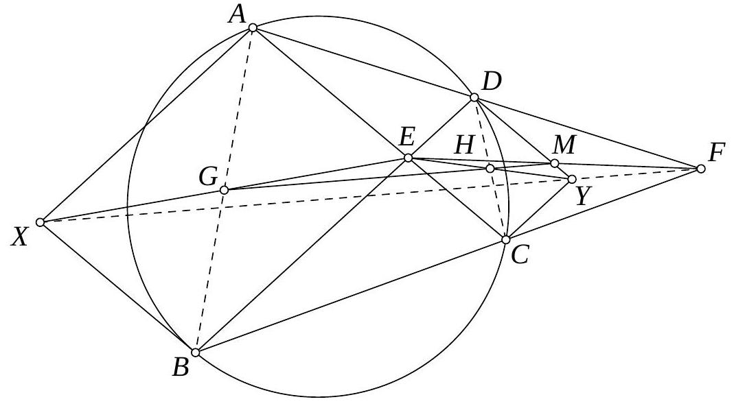 We use the following Lemma (Gauß). Let $A B C D$ be a quadrilateral. Let $A B$ and $C D$ intersect at $P$, and $B C$ and $D A$ intersect at $Q$. Then the midpoints $K, L, M$ of $A C, B D$, and $P Q$, respectively, are collinear. Proof: Let us consider the points $Z$ that fulfill the equation $$ (A B Z)+(C D Z)=(B C Z)+(D A Z) $$ where $(R S T)$ denotes the oriented area of the triangle $R S T$ (see Figure 2).  Figure 2 As (1) is linear in $Z$, it can either characterize a line, or be contradictory, or be trivially fulfilled for all $Z$ in the plane. If (1) was fulfilled for all $Z$, then it would hold for $Z=A, Z=B$, which gives $(C D A)=(B C A),(C D B)=(D A B)$, respectively, i.e. the diagonals of $A B C D$ would bisect each other, thus $A B C D$ would be a parallelogram. This contradicts the hypothesis that $A D$ and $B C$ intersect. Since $E, F, G$ fulfill (1), it is the equation of a line which completes the proof of the lemma. Now consider the parallelograms $E A X B$ and $E C Y D$ (see Figure 1). Then $G, H$ are the midpoints of $E X, E Y$, respectively. Let $M$ be the midpoint of $E F$. By applying the Lemma to the (re-entrant) quadrilateral $A D B C$, it is evident that $G, H$, and $M$ are collinear. A dilation by a factor of 2 with center $E$ shows that $X, Y, F$ are collinear. Since $A X \| D E$ and $B X \| C E$, we have pairwise equal interior angles in the quadrilaterals $F D E C$ and $F B X A$. Since we have also $\angle E B A=\angle D C A=\angle C D Y$, the quadrilaterals are similar. Thus, $\angle F X A=\angle C E F$. Clearly the parallelograms $E C Y D$ and $E B X A$ are similar, too, thus $\angle E X A=\angle C E Y$. Consequently, $\angle F X E=\angle F X A-\angle E X A=\angle C E F-\angle C E Y=\angle Y E F$. By the converse of the tangent-chord angle theorem $E F$ is tangent to the circle $X E Y$. A dilation by a factor of $\frac{1}{2}$ completes the proof.
